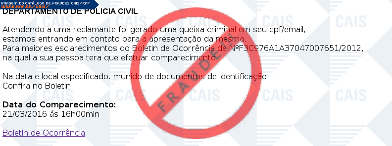 | comentário | A vítima recebe um email dizendo que foi realizada uma queixa em seu CPF e passa um link para um suposto boletim de ocorrência. Entretanto, o link leva ao download de um malware de nome Trojan-Downloader.Script.Generic. | |