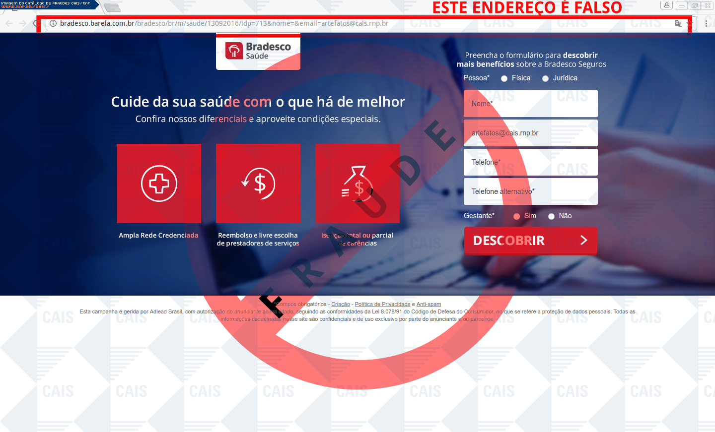 | comentário | Email em nome do Bradesco Saúde disponibiliza link para cadastro em plano odontológico, site é falso e rouba informações do usuário. | |