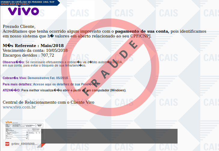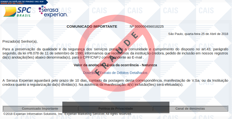 Esta página tem função informativa e educativa. Exibe uma coleção de imagens de phishing scam (fraudes eletrônicas) ou malware (código malicioso) veiculados por meio de spam (e-mail não-solicitado). Trata-se de conteúdo exemplificativo, não exaustivo, uma vez que não é possível contemplar todos os casos de fraudes existentes. Assim, caso você tenha conhecimento de um exemplar que não esteja aqui presente, isto não significa que não seja válido ou real. Inclusive incentivamos que você o envie para análise do CAIS para que, se for o caso, passe a integrar o nosso acervo.