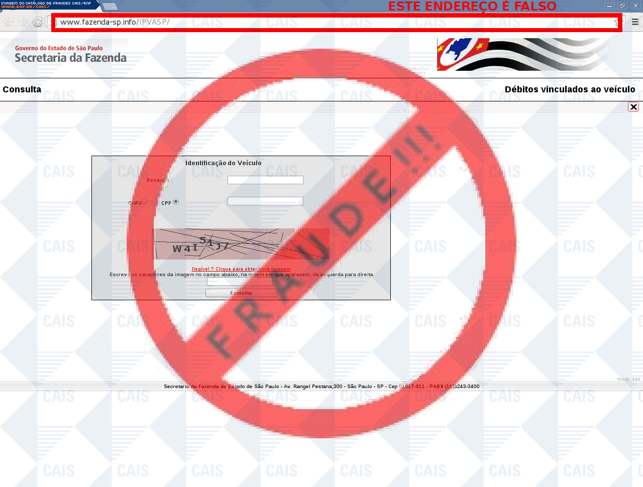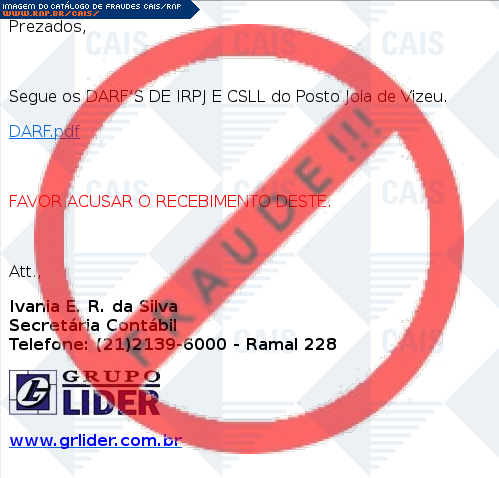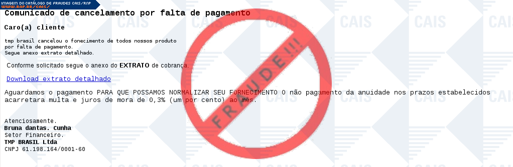 Esta página tem função informativa e educativa. Exibe uma coleção de imagens de phishing scam (fraudes eletrônicas) ou malware (código malicioso) veiculados por meio de spam (e-mail não-solicitado). Trata-se de conteúdo exemplificativo, não exaustivo, uma vez que não é possível contemplar todos os casos de fraudes existentes. Assim, caso você tenha conhecimento de um exemplar que não esteja aqui presente, isto não significa que não seja válido ou real. Inclusive incentivamos que você o envie para análise do CAIS para que, se for o caso, passe a integrar o nosso acervo.