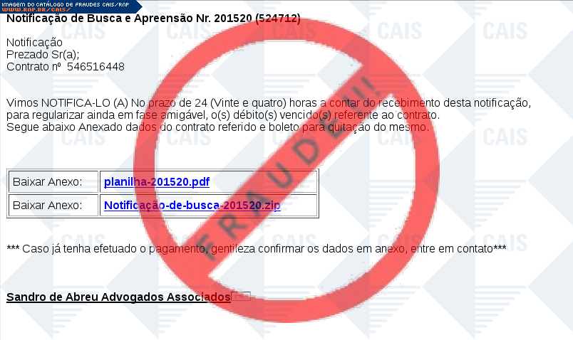 | comentário | A vítima recebe um email dizendo que em anexo há uma notificação referente a uma ação judicial movida contra ela. Entretanto, o link para download leva a um malware que tenta infectar o computador da vítima. | |