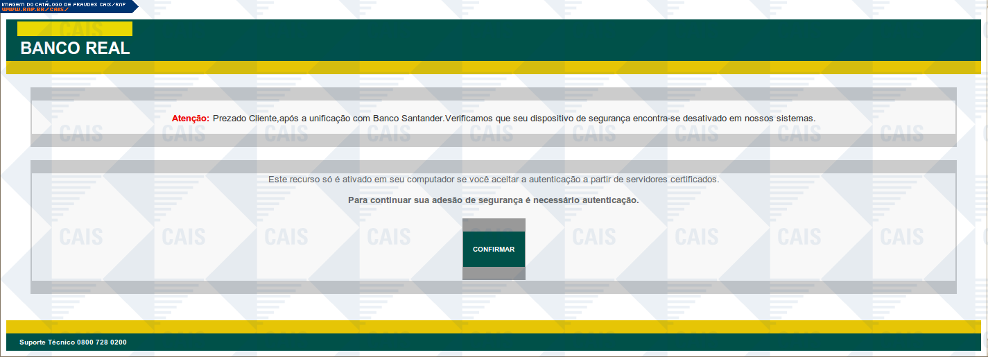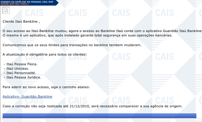 Esta página tem função informativa e educativa. Exibe uma coleção de imagens de phishing scam (fraudes eletrônicas) ou malware (código malicioso) veiculados por meio de spam (e-mail não-solicitado). Trata-se de conteúdo exemplificativo, não exaustivo, uma vez que não é possível contemplar todos os casos de fraudes existentes. Assim, caso você tenha conhecimento de um exemplar que não esteja aqui presente, isto não significa que não seja válido ou real. Inclusive incentivamos que você o envie para análise do CAIS para que, se for o caso, passe a integrar o nosso acervo.