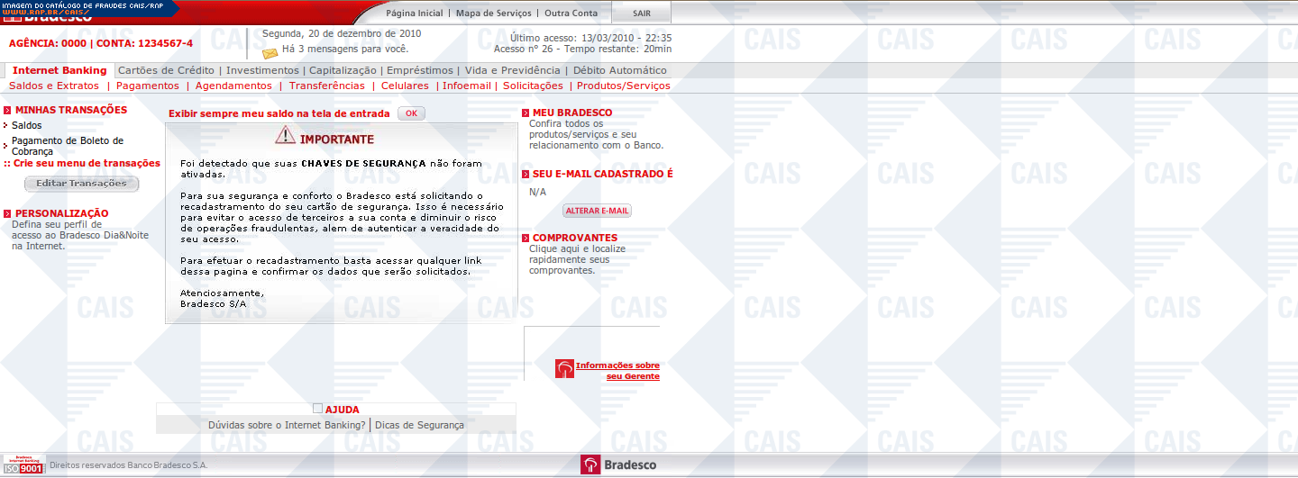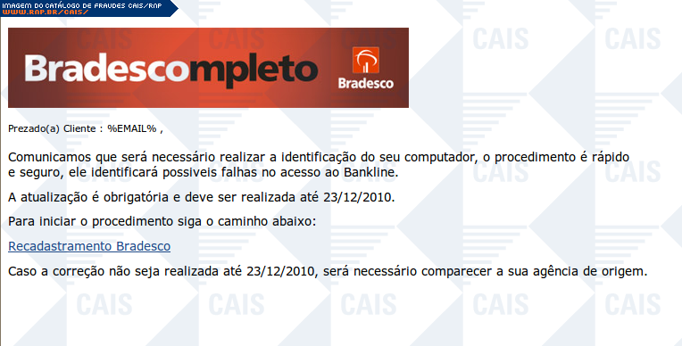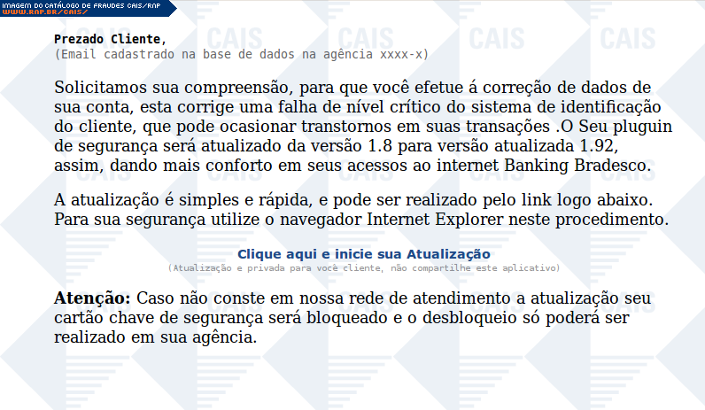 | comentário | Mensagem falsa do banco Bradesco solicitando que a vítima efetue acorreção de dados de sua conta para corrigir uma falha de nível crítico do sistema de identificação do cliente. A fraude solicita que a vítima realize a suposta atualização utilizando o navegador... (leia mais) | |