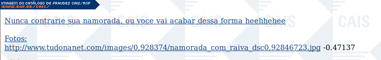| comentário | Mensagem em tom amigável tentando simular o envio de imagens engraçadas. O assunto da mensagem dá a entender que as imagens são de uma espécie de vingança de uma namorada com raiva. O link leva a um arquivo malicioso que foi identificado como W32/Obfuscated.A!genr... (leia mais) | |