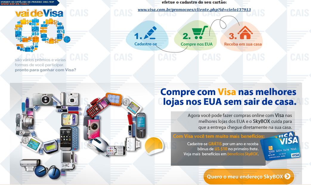 | comentário | Mais uma mensagem falsa se passando pela Visa anunciando a promoção Visa Go. A fraude contém um link para se cadastrar promoção. O link leva a uma página falsa destinada a roubar os dados da vítima. | |