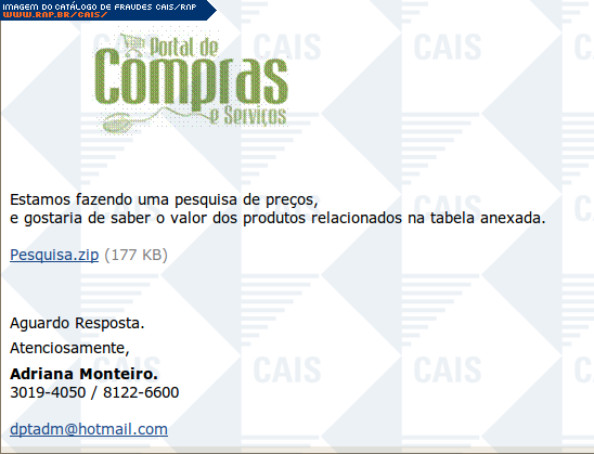 | comentário | Mensagem de uma suposta empresa que estaria realizando uma pesquisa de preços. A fraude contém um anexo que leva a um arquivo malicioso que foi identificado como Trojan-Spy:W32/Banker.JGT (F-Secure). | |