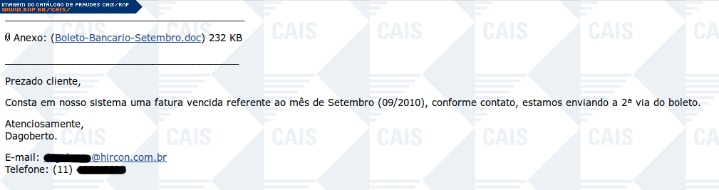 | comentário | Suposta mensagem da empresa Hircon notificando sobre uma fatura vencida. A fraude contém um link para a segunda via do boleto. O link leva a uma página falsa de onde é feito o download de um software malicioso que foi identificado como Gen:Variant.Kazy.3119... (leia mais) | |