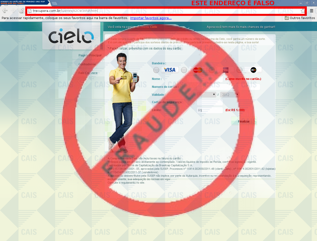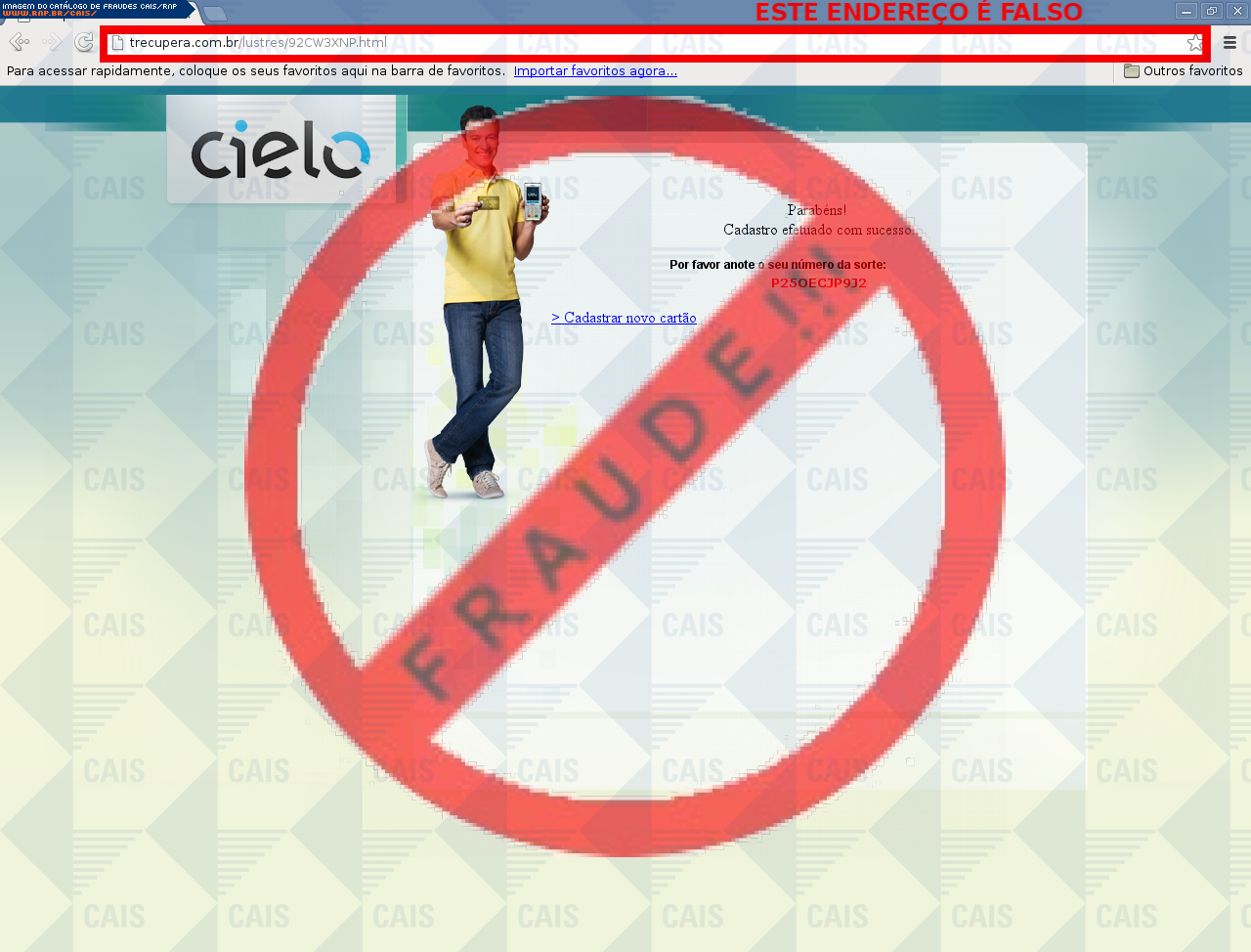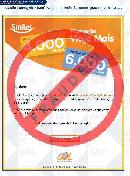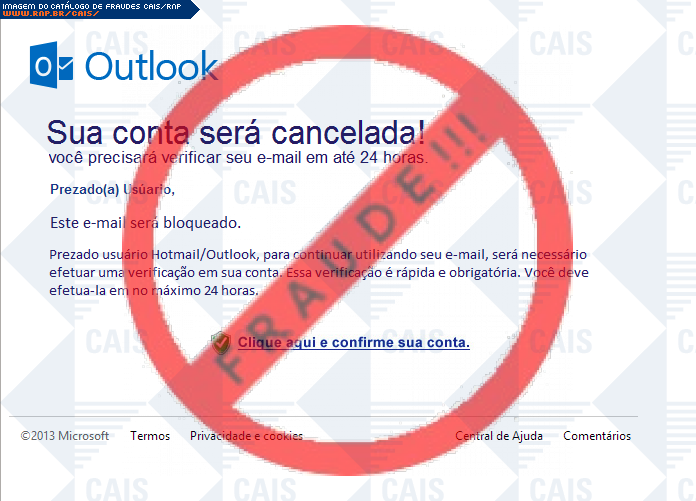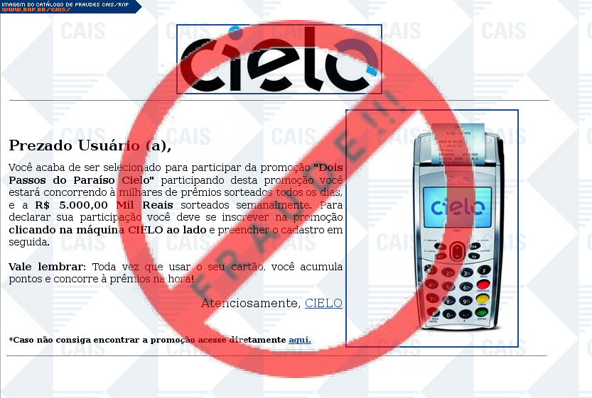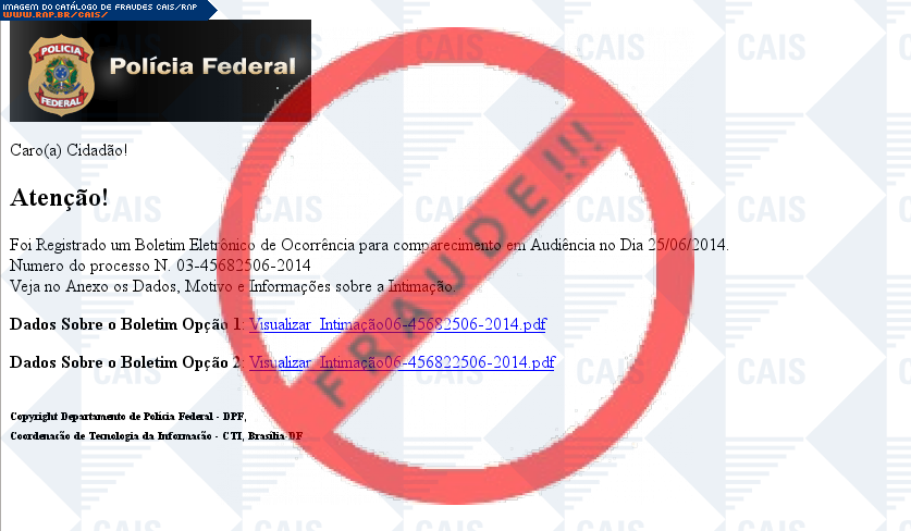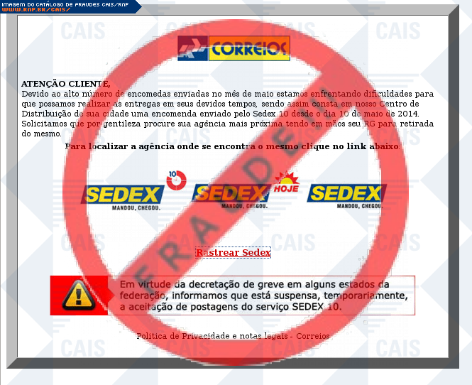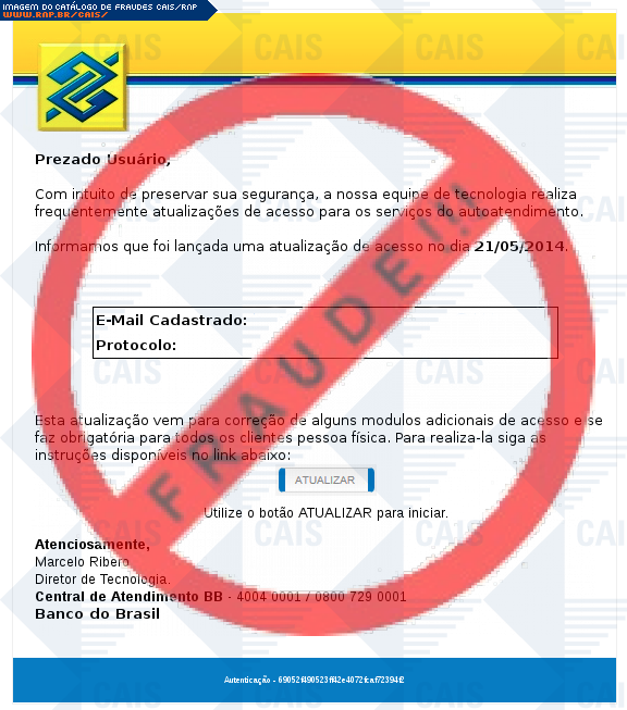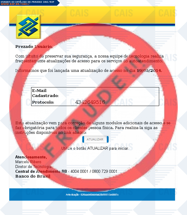 Esta página tem função informativa e educativa. Exibe uma coleção de imagens de phishing scam (fraudes eletrônicas) ou malware (código malicioso) veiculados por meio de spam (e-mail não-solicitado). Trata-se de conteúdo exemplificativo, não exaustivo, uma vez que não é possível contemplar todos os casos de fraudes existentes. Assim, caso você tenha conhecimento de um exemplar que não esteja aqui presente, isto não significa que não seja válido ou real. Inclusive incentivamos que você o envie para análise do CAIS para que, se for o caso, passe a integrar o nosso acervo.