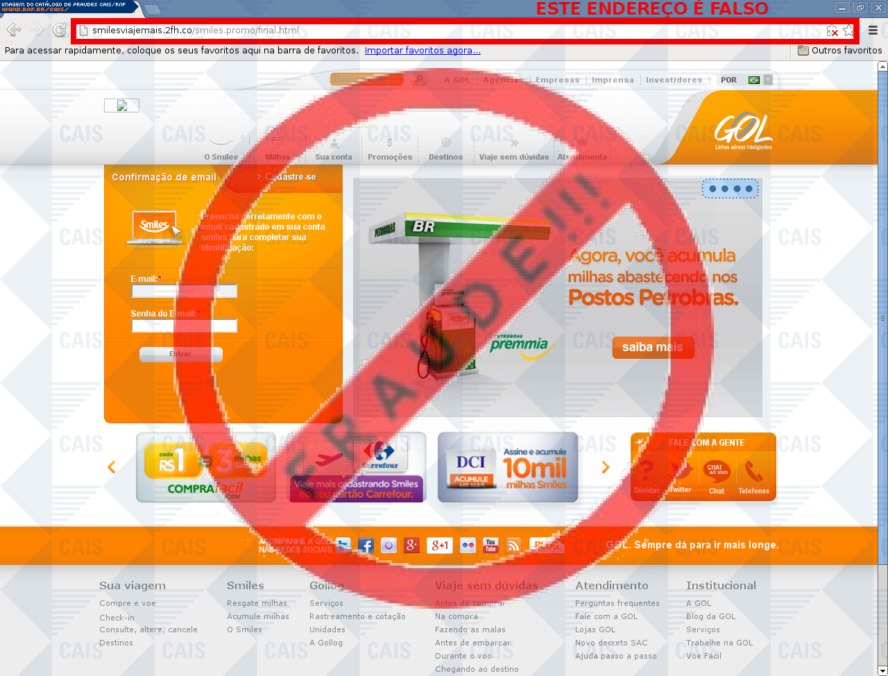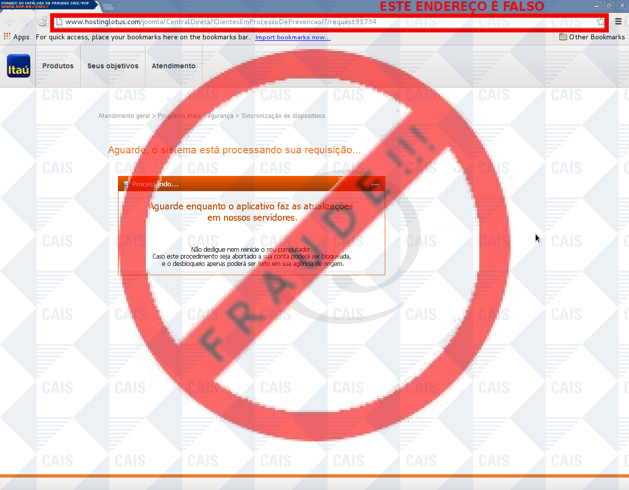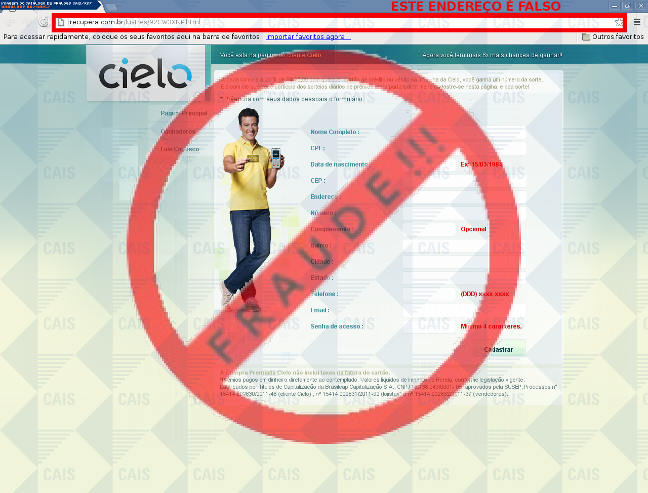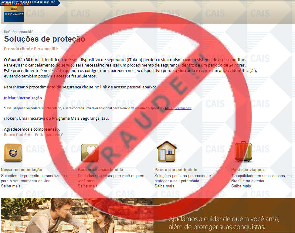 Esta página tem função informativa e educativa. Exibe uma coleção de imagens de phishing scam (fraudes eletrônicas) ou malware (código malicioso) veiculados por meio de spam (e-mail não-solicitado). Trata-se de conteúdo exemplificativo, não exaustivo, uma vez que não é possível contemplar todos os casos de fraudes existentes. Assim, caso você tenha conhecimento de um exemplar que não esteja aqui presente, isto não significa que não seja válido ou real. Inclusive incentivamos que você o envie para análise do CAIS para que, se for o caso, passe a integrar o nosso acervo.