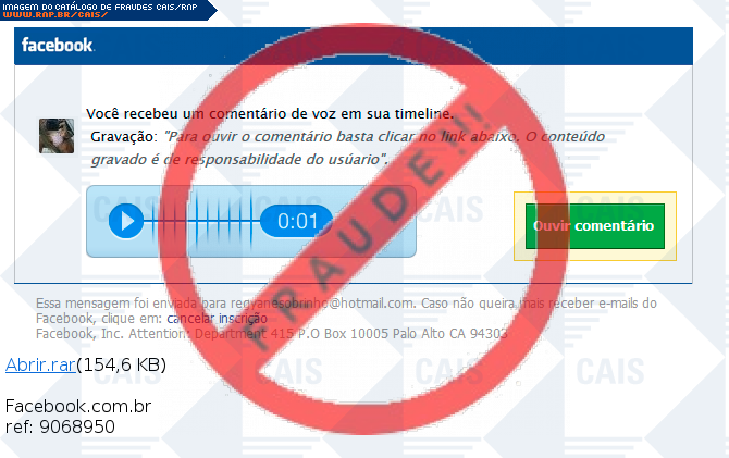 | comentário | A vítima recebe uma mensagem indicando que possui um comentário de voz no facebook, quando na verdade trata se arquivo malicioso com o nome de Gen:Variant.Barys.3546. | |