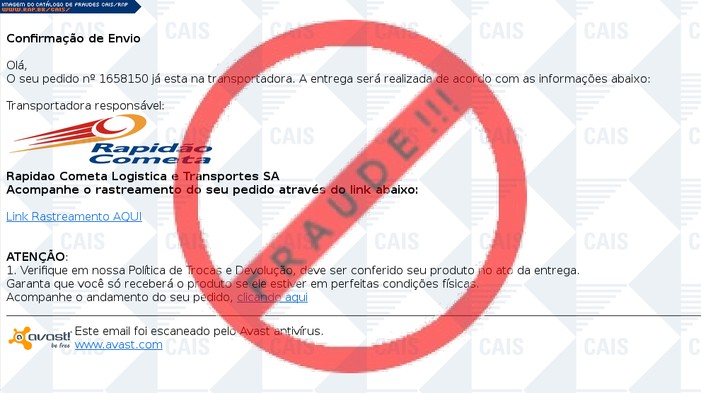 Com a disponibilização pública deste serviço, não é intenção do Centro de Atendimento a Incidentes de Segurança (CAIS) da Rede Nacional de Ensino e Pesquisa (RNP) violar direitos autorais sobre marcas registradas ou logotipos de empresas que porventura constem das amostras. O objetivo é tão somente alertar os usuários sobre as espécies de golpes que se utilizam de tais propriedades intelectuais ou industriais de forma criminosa.