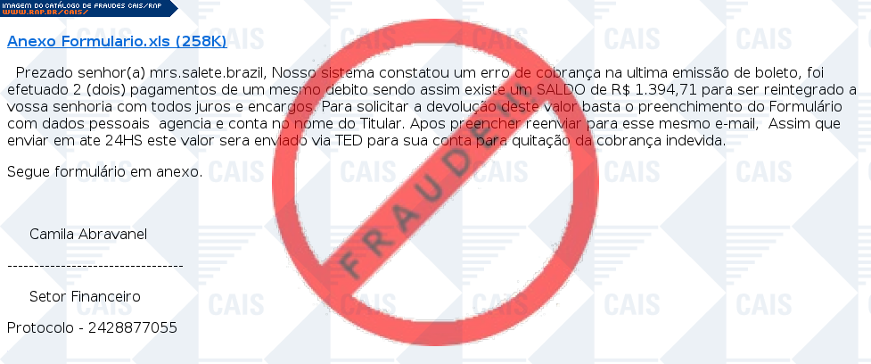 Esta página tem função informativa e educativa. Exibe uma coleção de imagens de phishing scam (fraudes eletrônicas) ou malware (código malicioso) veiculados por meio de spam (e-mail não-solicitado). Trata-se de conteúdo exemplificativo, não exaustivo, uma vez que não é possível contemplar todos os casos de fraudes existentes. Assim, caso você tenha conhecimento de um exemplar que não esteja aqui presente, isto não significa que não seja válido ou real. Inclusive incentivamos que você o envie para análise do CAIS para que, se for o caso, passe a integrar o nosso acervo.