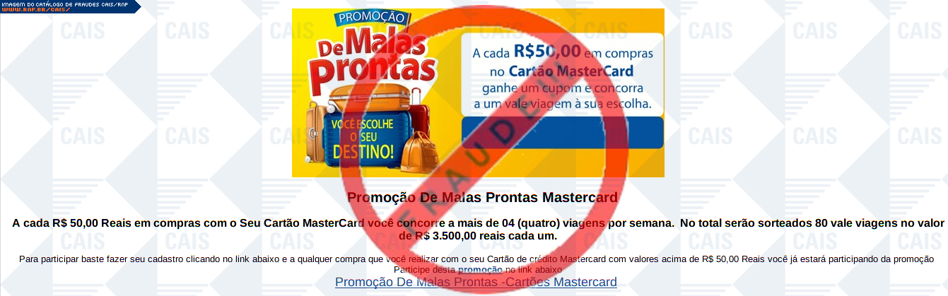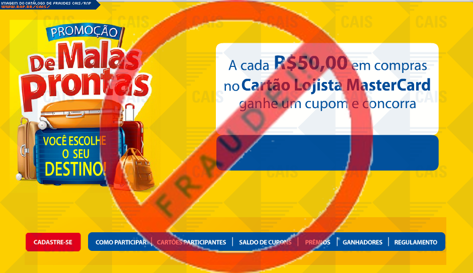 | comentário | Nessa ocorrencia o usuario recebe uma mensagem informando que foi selecionado para uma promoção, mas que para participar deve se cadastrar no site, ao clicar no link o usuario é encaminhado para uma pagina falsa de uma outra instituição que solicita a confirmação... (leia mais) | |