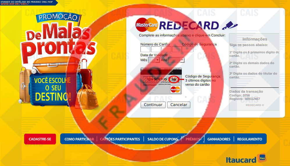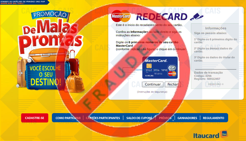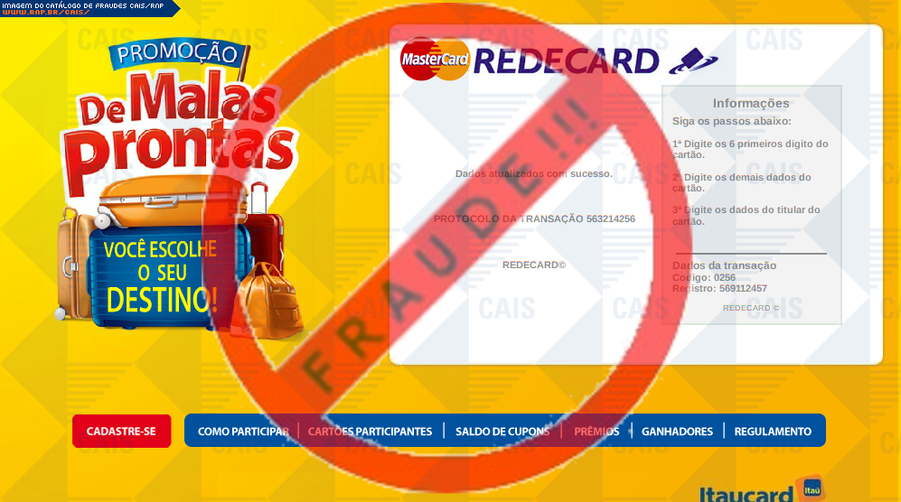 | comentário | Nessa ocorrencia o usuario recebe um informativo de promoção de uma administradora de cartões de credito, mas ao clicar no link de casdastro o mesmo é direcionado a uma pagina falsa que solicita dados sensiveis tais como cpf e cartões de credito.O que evindencia... (leia mais) | |