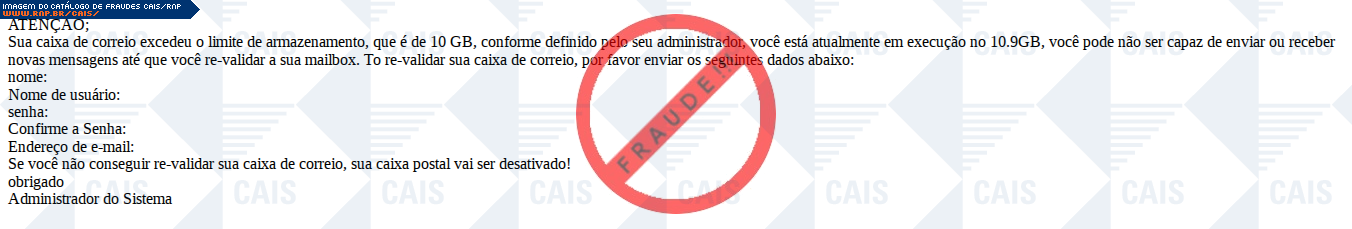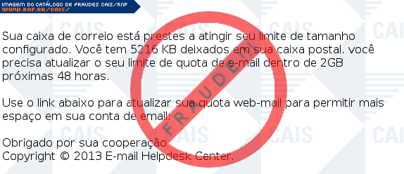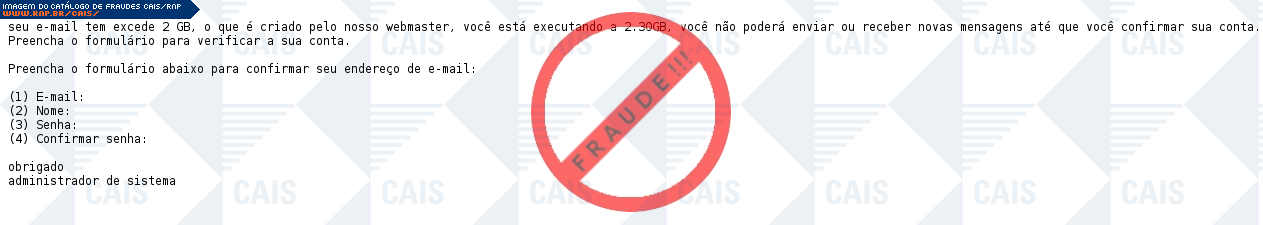| comentário | Uma mensagem é encaminhada informando que o usuário excedeu a sua cota de e-mail e que necessita enviar os seus dados para atualizar a mesma, porém a mensagem solicita o envio de dados sensíveis tais como nome de usuário e senha de acesso. | |