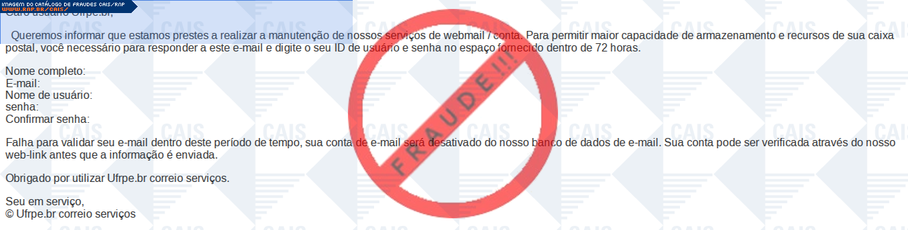 | comentário | Nesta fraude o usuário recebe um email orientando-o a recadastrar seu endereço e senha de email através de um link na mensagem. Porém ao clicar no link o usuário é levado a uma página usada para a prática de phishing. | |
