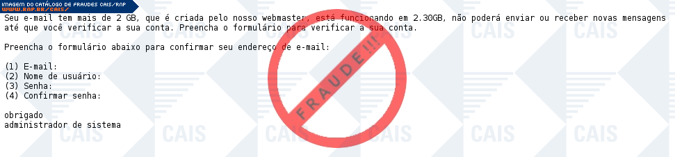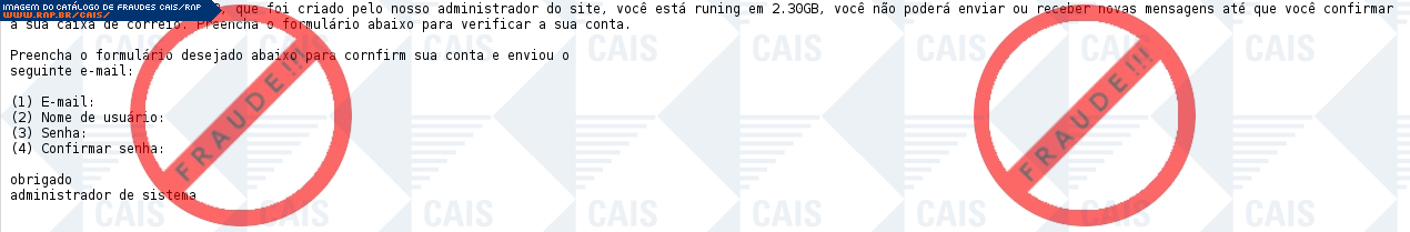 | comentário | O usuário recebe uma mensagem informando que a sua cota de e-mail foi excedida e que para regularizar a sua conta de e-mail o mesmo deverá preencher os dados solicitados no link, mas esse link o leva para um site contendo um formulário que solicita usuário... (leia mais) | |