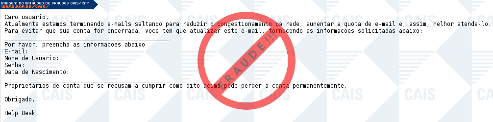 | comentário | O fraudador encaminha uma mensagem ao usuário solicitando que atualize a sua conta de e-mail respondendo a mensagem com seus dados pessoais e senha de acesso ao e-mail. Caracterizando uma tentativa de phishing. | |