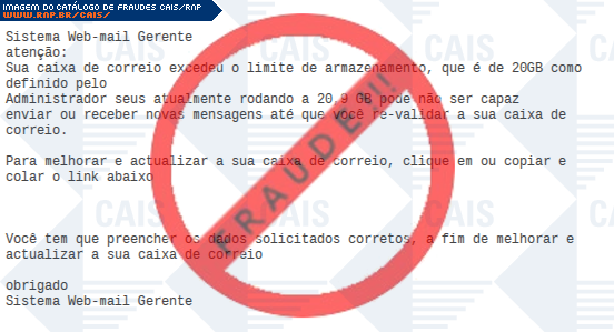 | comentário | Phishing: Mais uma fraude em que uma mensagem é enviada ao usuário informando que a sua cota de e-mail foi excedida e lhe são solicitados dados para atualização da mesma, porém os dados que são solicitados permitiriam o fraudador a acessar a conta de e-mail... (leia mais) | |
