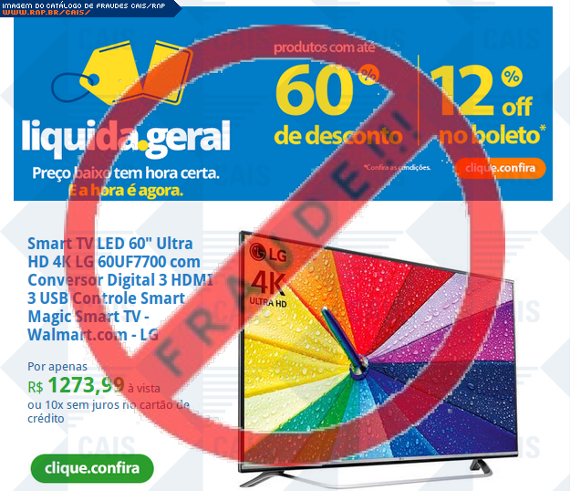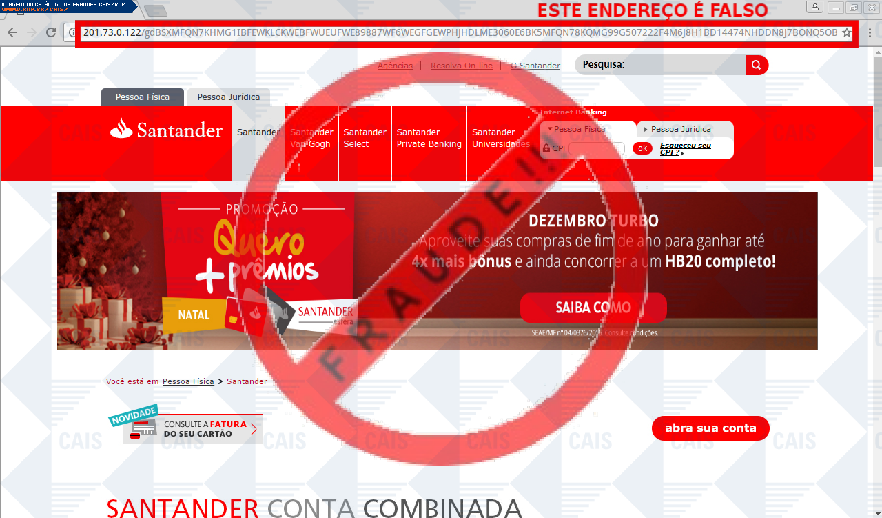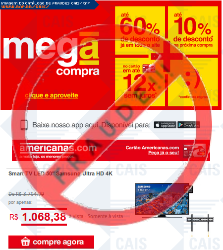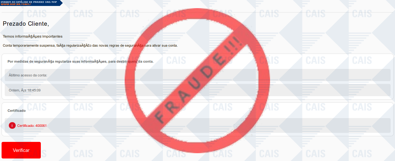 Esta página tem função informativa e educativa. Exibe uma coleção de imagens de phishing scam (fraudes eletrônicas) ou malware (código malicioso) veiculados por meio de spam (e-mail não-solicitado). Trata-se de conteúdo exemplificativo, não exaustivo, uma vez que não é possível contemplar todos os casos de fraudes existentes. Assim, caso você tenha conhecimento de um exemplar que não esteja aqui presente, isto não significa que não seja válido ou real. Inclusive incentivamos que você o envie para análise do CAIS para que, se for o caso, passe a integrar o nosso acervo.