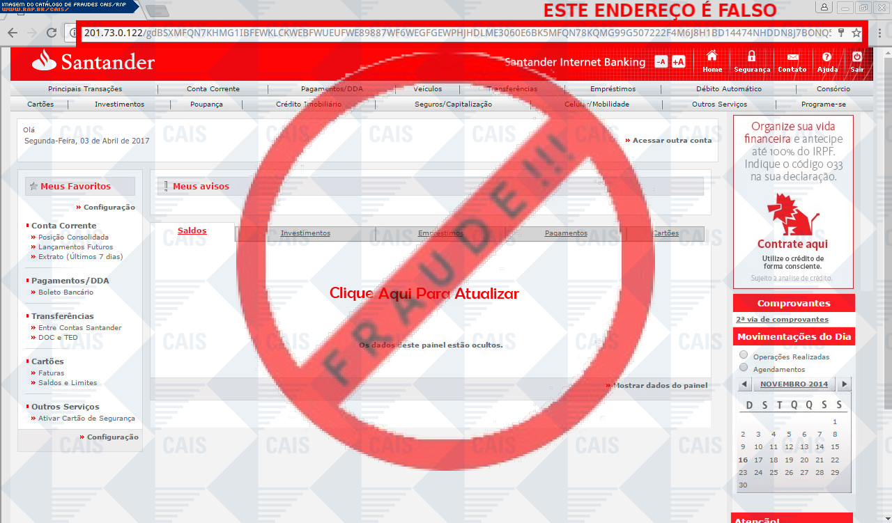 | comentário | O usuário recebe uma mensagem informando que o sistema do banco Santander atualizou sendo necessário realizar uma atualização também na sua conta, no entanto a página é falsa destinada a roubar as informações bancárias do usuário. | |