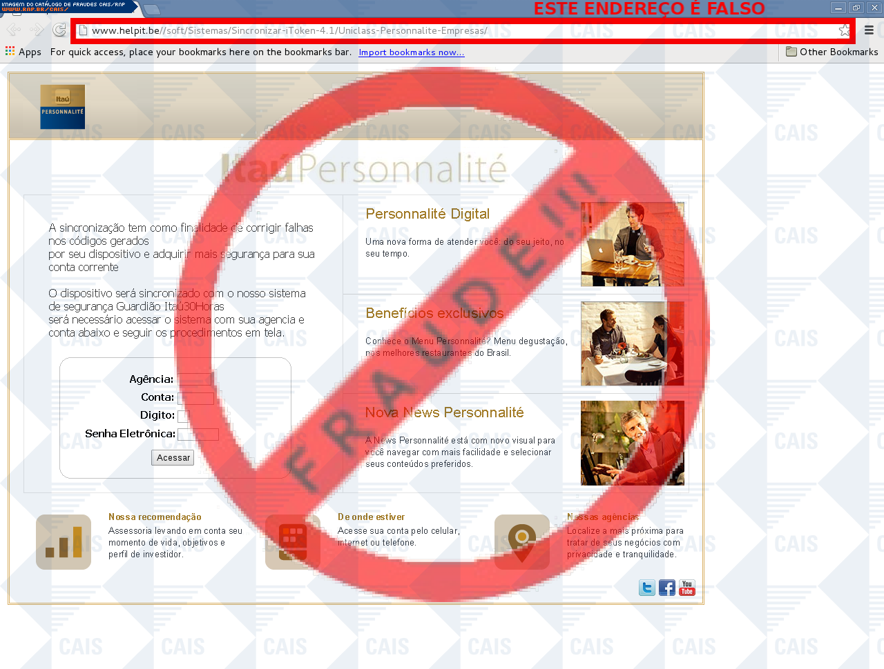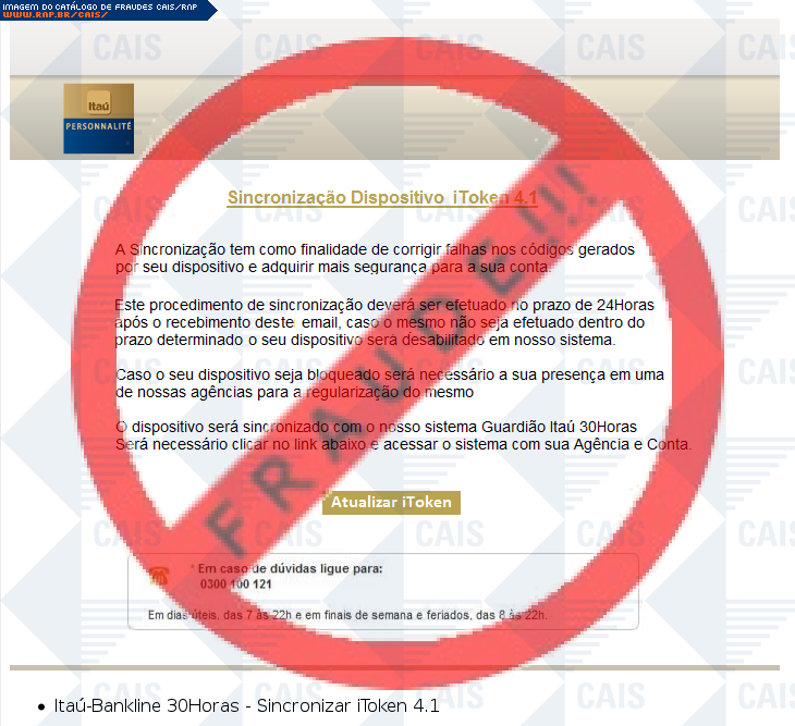 | comentário | A vítima recebe uma mensagem informando que seu cartão itoken, da conta no banco Itaú, não está sincronizado sendo necessário realizar a sincronização no link disponível, entretanto a página é falsa criada para roubar os dados bancários do usuário. | |
