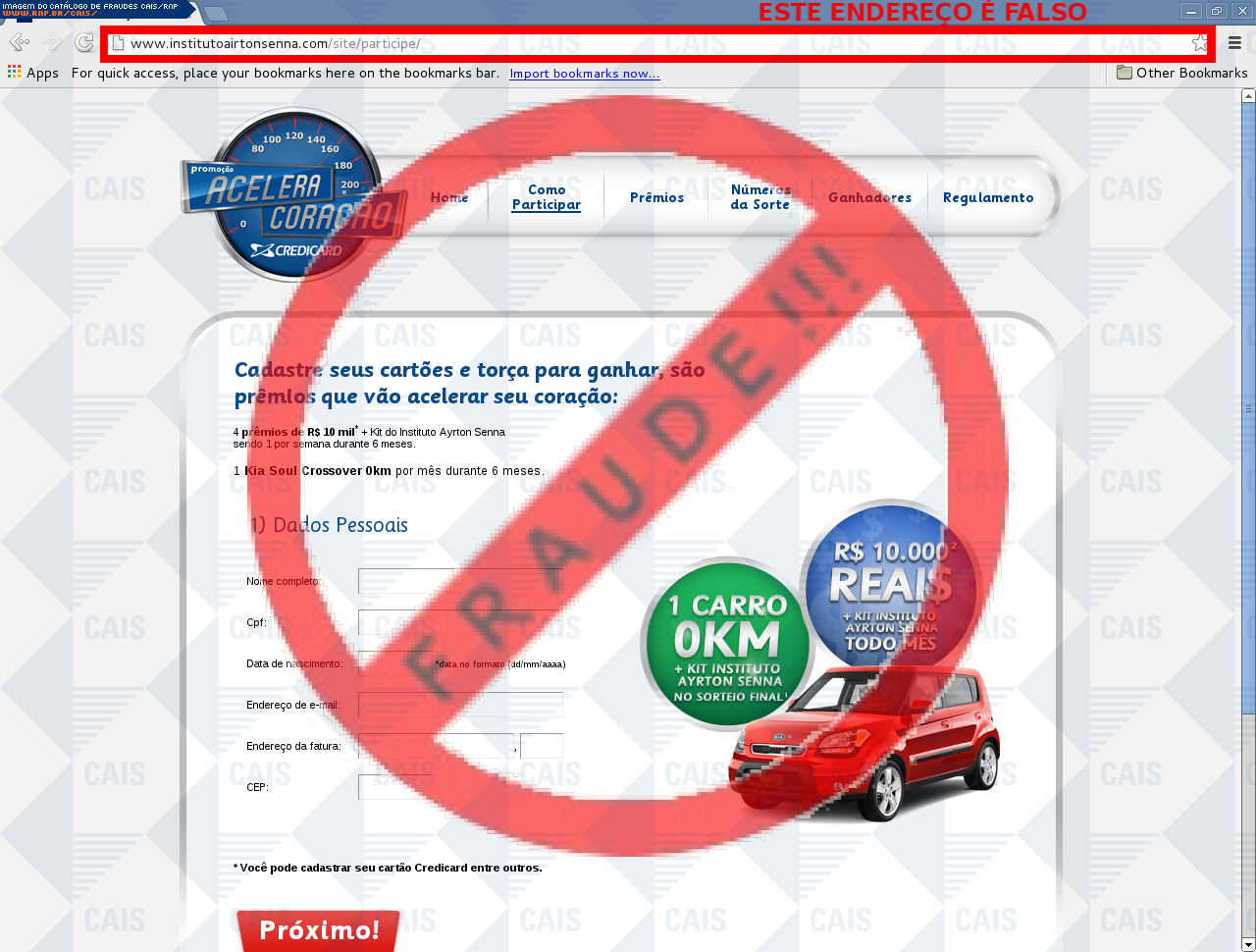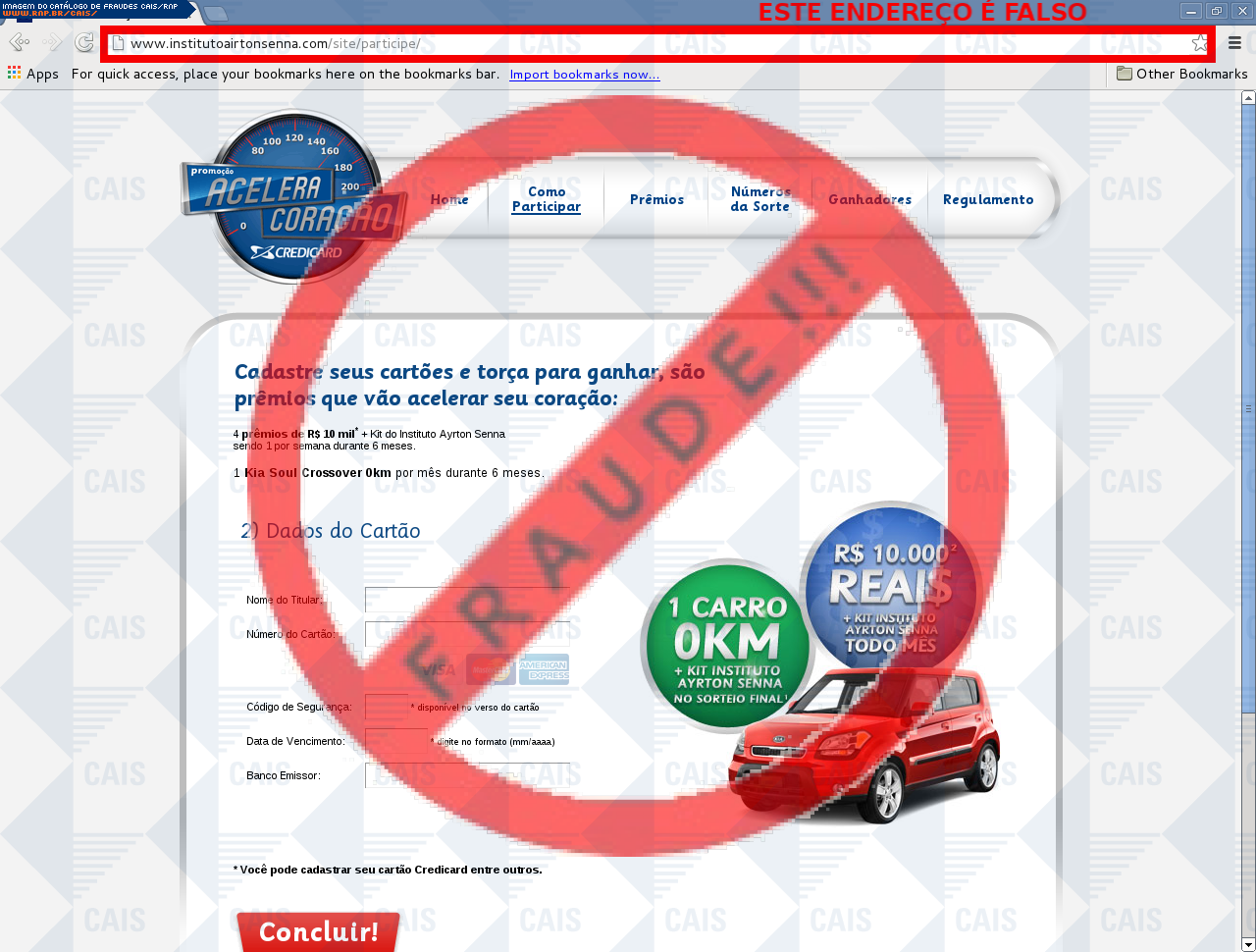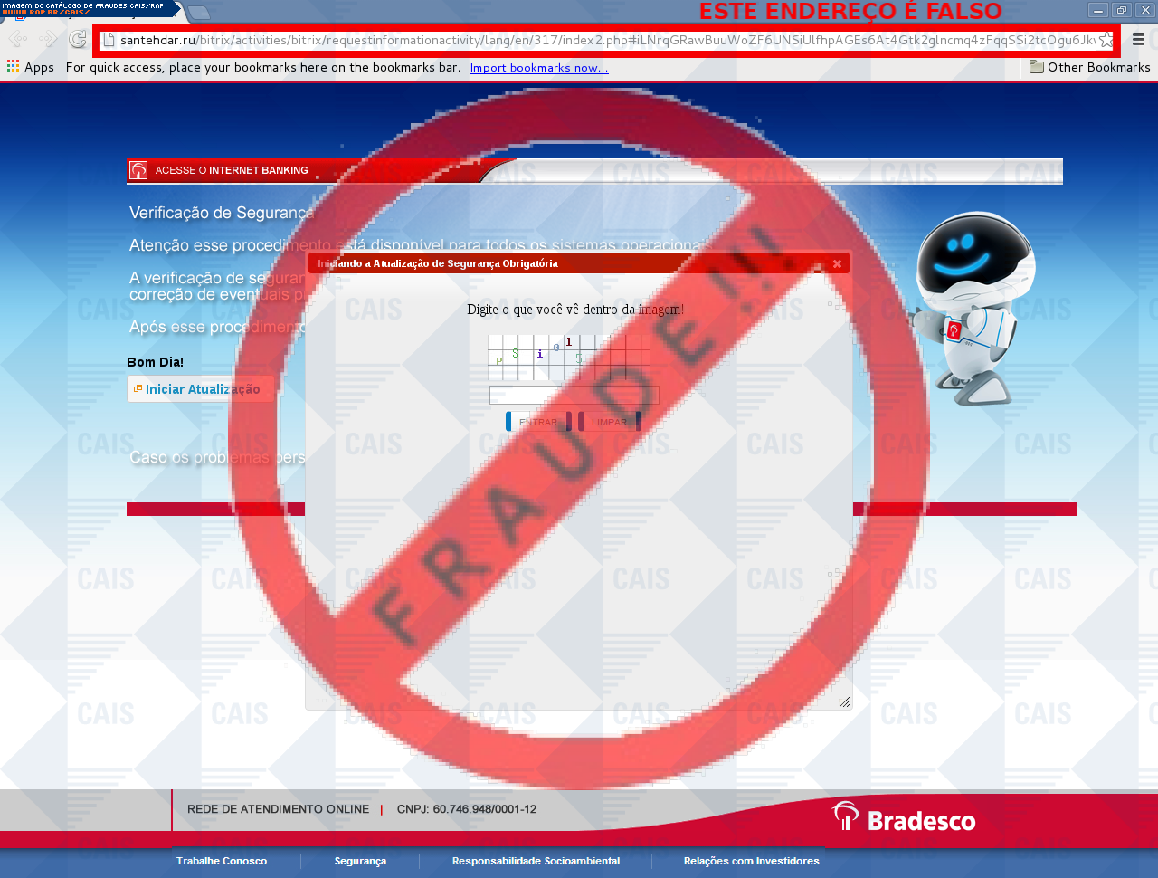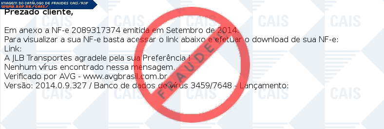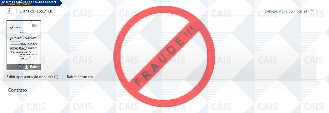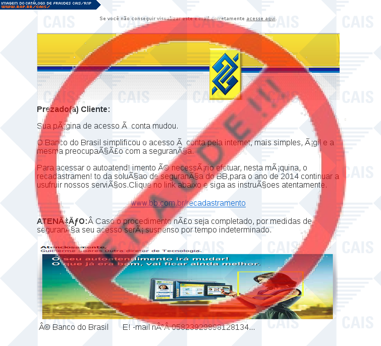 Esta página tem função informativa e educativa. Exibe uma coleção de imagens de phishing scam (fraudes eletrônicas) ou malware (código malicioso) veiculados por meio de spam (e-mail não-solicitado). Trata-se de conteúdo exemplificativo, não exaustivo, uma vez que não é possível contemplar todos os casos de fraudes existentes. Assim, caso você tenha conhecimento de um exemplar que não esteja aqui presente, isto não significa que não seja válido ou real. Inclusive incentivamos que você o envie para análise do CAIS para que, se for o caso, passe a integrar o nosso acervo.