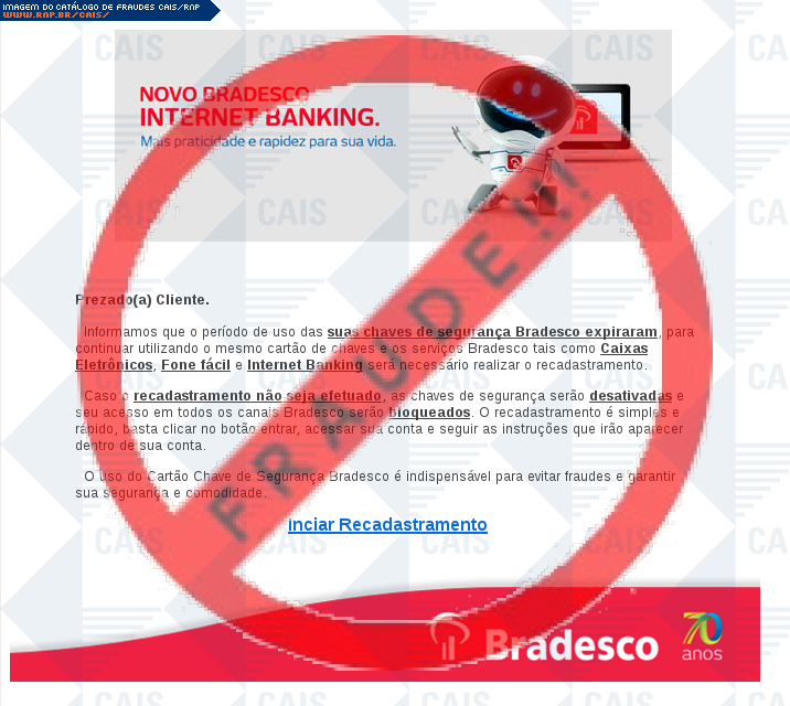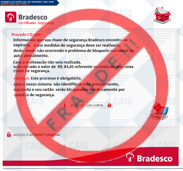| comentário | O usuário recebe um e-mail informando que sua chave de segurança da conta do banco Bradesco expirou sendo necessário realizar uma atualização no link disponibilizado, entretanto a página fornecida é falsa criada para roubar os dados bancários da vítima. | |