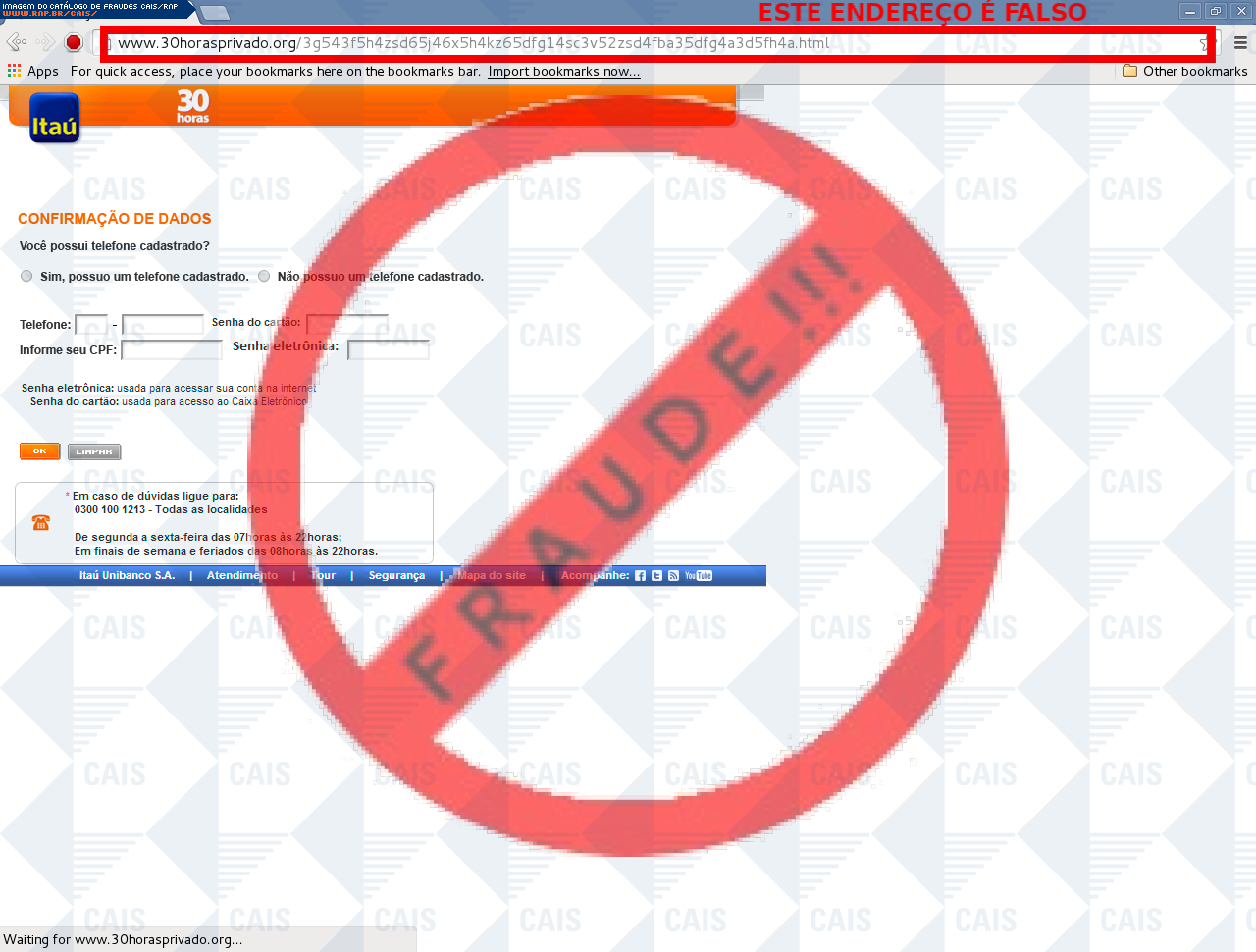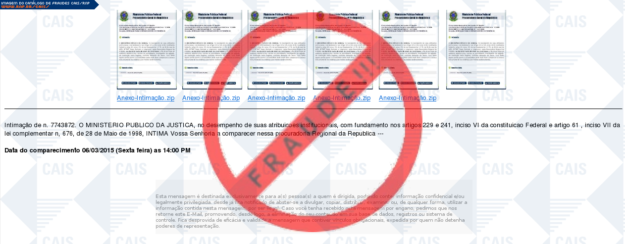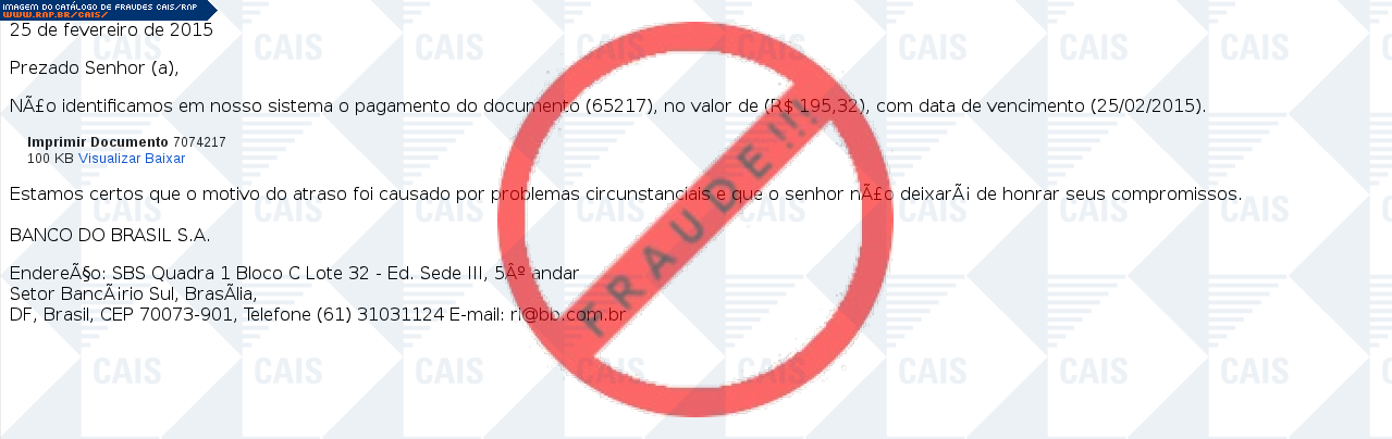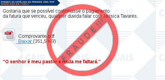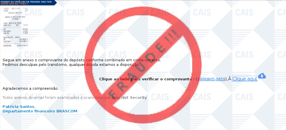 Esta página tem função informativa e educativa. Exibe uma coleção de imagens de phishing scam (fraudes eletrônicas) ou malware (código malicioso) veiculados por meio de spam (e-mail não-solicitado). Trata-se de conteúdo exemplificativo, não exaustivo, uma vez que não é possível contemplar todos os casos de fraudes existentes. Assim, caso você tenha conhecimento de um exemplar que não esteja aqui presente, isto não significa que não seja válido ou real. Inclusive incentivamos que você o envie para análise do CAIS para que, se for o caso, passe a integrar o nosso acervo.