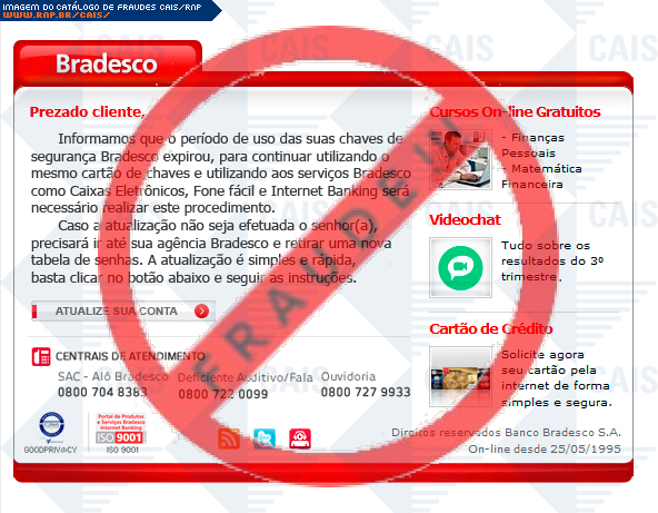 | comentário | O usuário recebe um e-mail informando que o período de uso da sua chave de segurança da conta do banco Bradesco expirou sendo necessário realizar uma atualização no link disponibilizado, entretanto a página fornecida é falsa criada para roubar os dados bancários... (leia mais) | |
