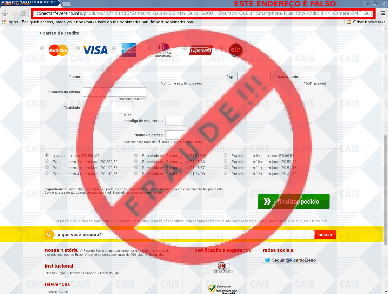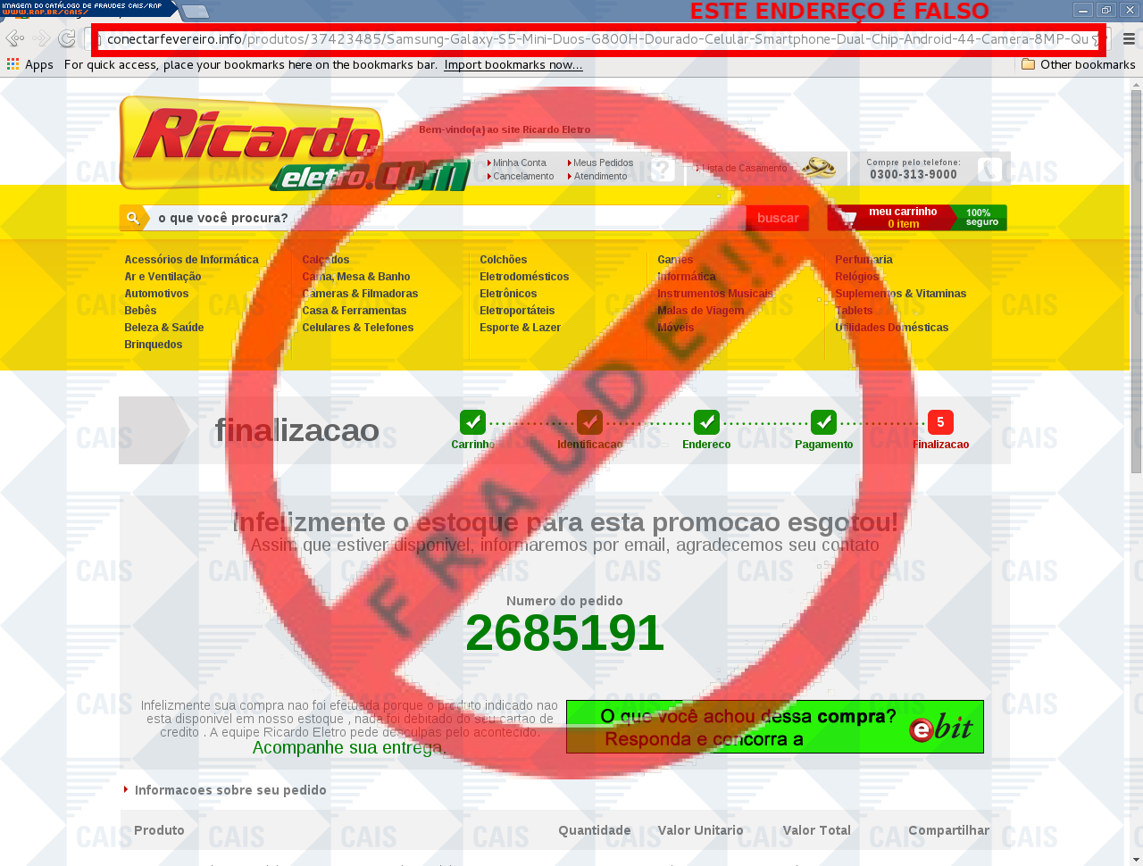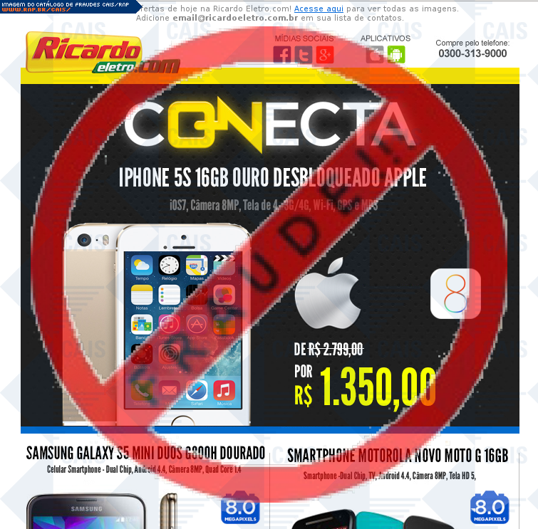 | comentário | A vítima recebe um e-mail informando sobre promoções no site de compra da loja Ricardo Eletro disponibilizando link de vários produtos em desconto, no entanto a página é falsa destinada a roubar as informações pessoais e do cartão do usuário. | |