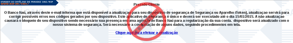 | comentário | A vítima recebe uma mensagem informando que seu dispositivo de segurança ou itoken referente a uma conta no banco Itaú possui uma atualização disponível sendo necessário realiza-la no link disponível, entretanto a página é falsa criada para roubar os dados... (leia mais) | |
