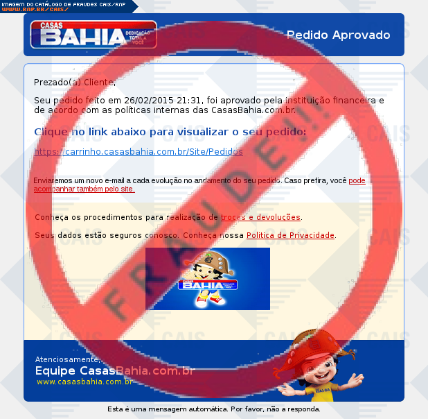 | comentário | A vítima recebe um e-mail contendo informações a respeito de um pedido aprovado referente a loja Casas Bahia, com detalhes do pedido disponíveis para download, no entanto o arquivo originado é malicioso destinado a roubar informações da máquina do usuário... (leia mais) | |