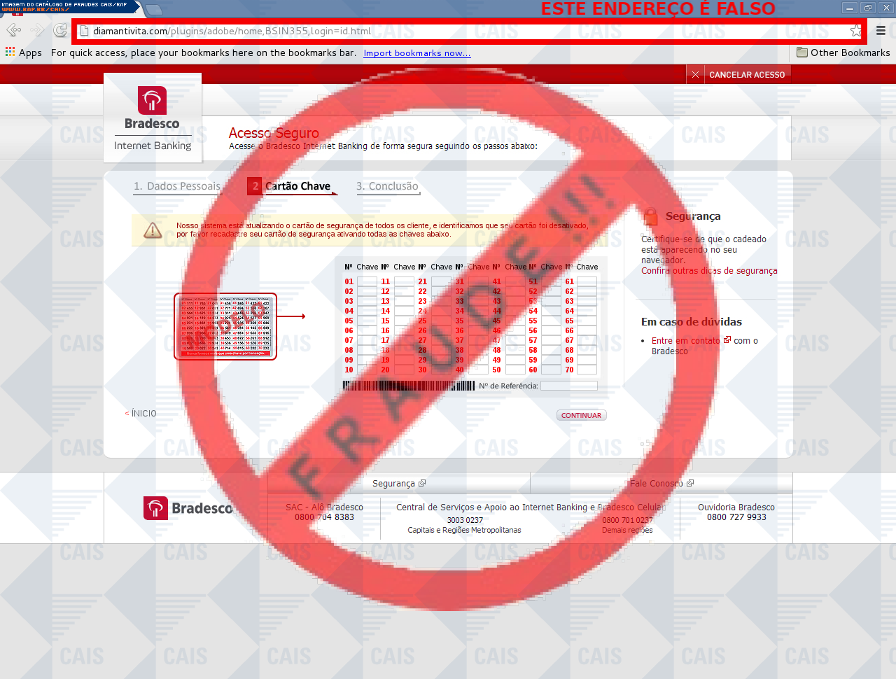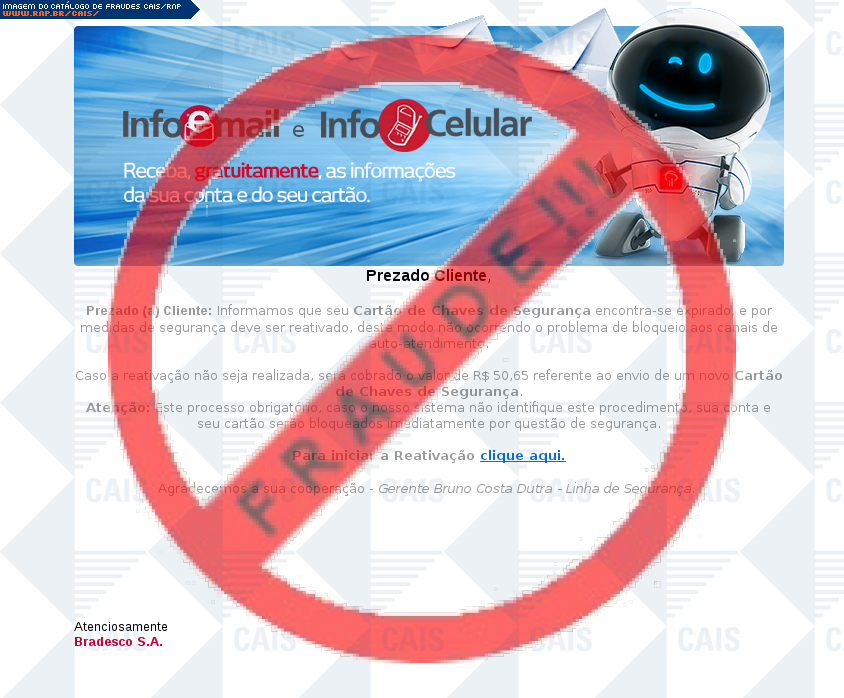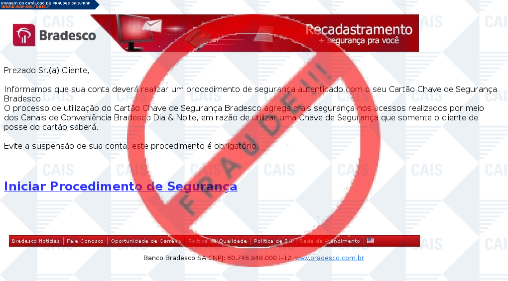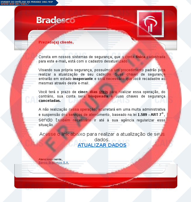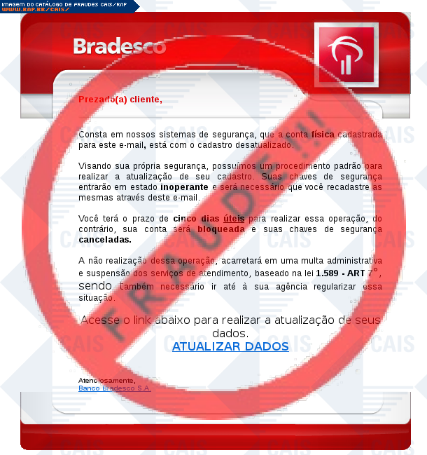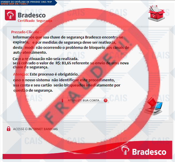 | comentário | O usuário recebe um e-mail informando que sua chave de segurança da conta do banco Bradesco encontra-se desatualizado sendo necessário realizar a atualização no link disponibilizado, entretanto a página fornecida é falsa criada para roubar os dados bancários... (leia mais) | |