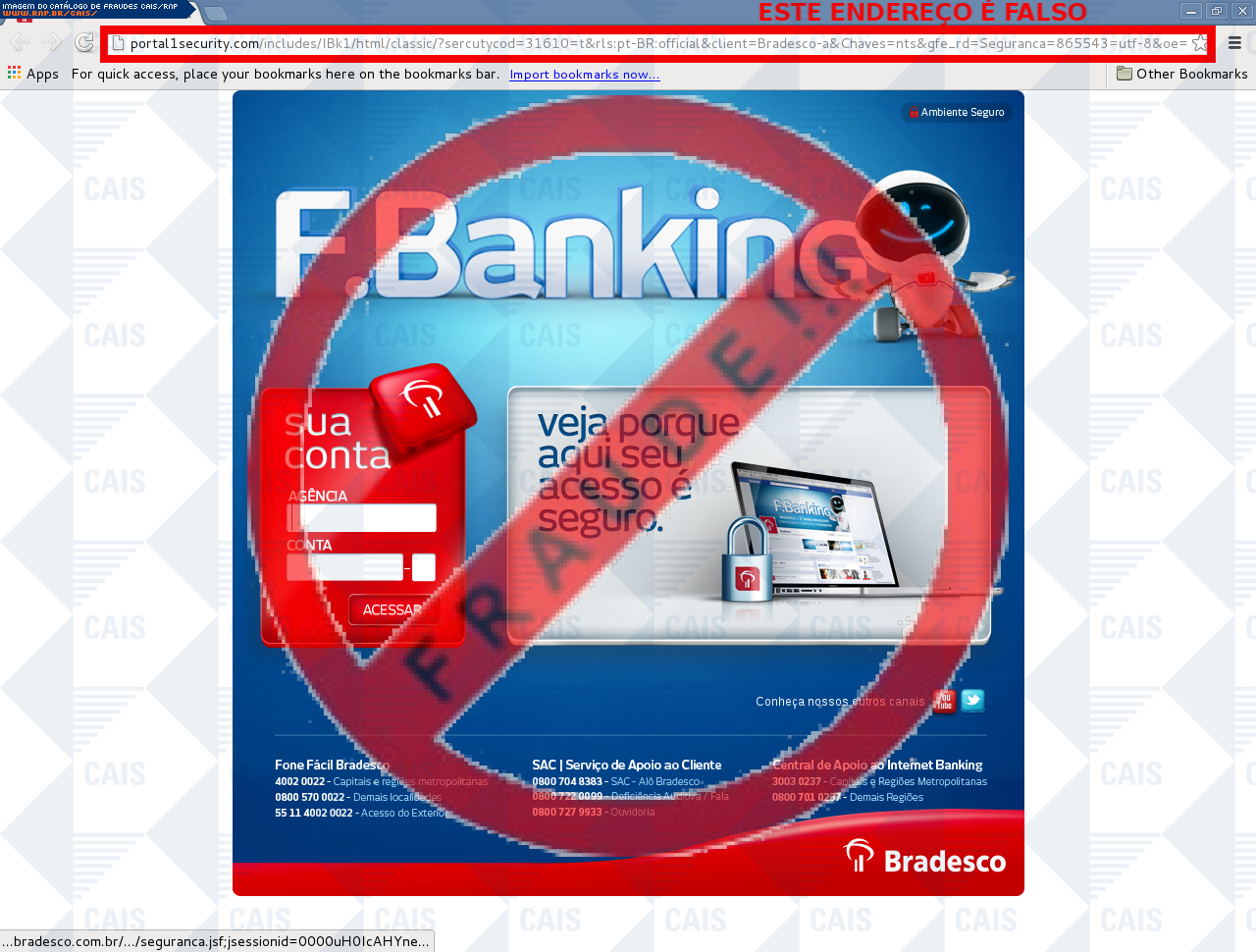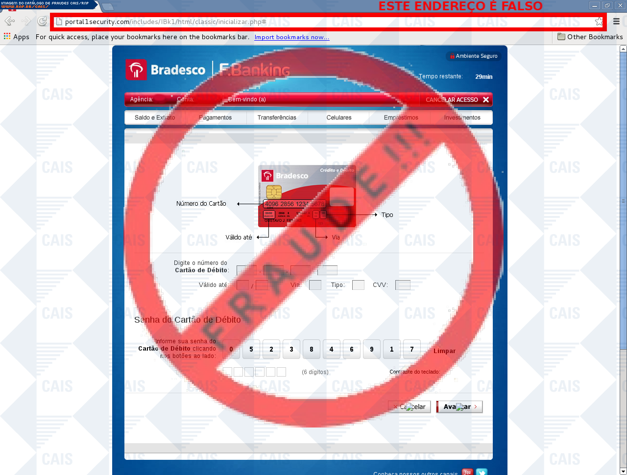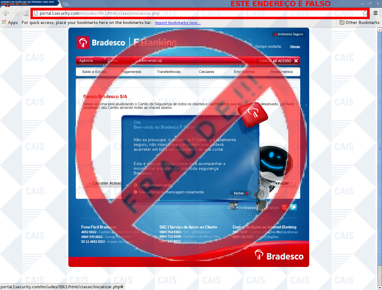 | comentário | O usuário recebe um e-mail informando que sua chave de segurança da conta do banco Bradesco encontra-se desatualizado sendo necessário realizar a atualização no link disponibilizado, entretanto a página fornecida é falsa criada para roubar os dados bancários... (leia mais) | |