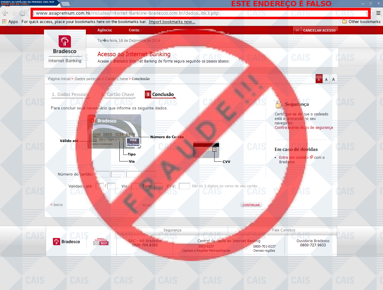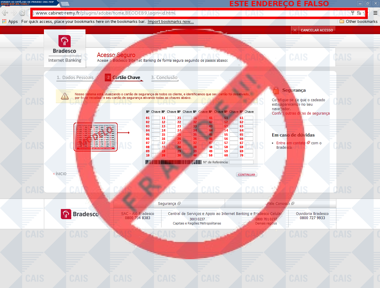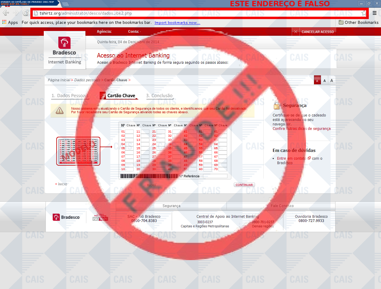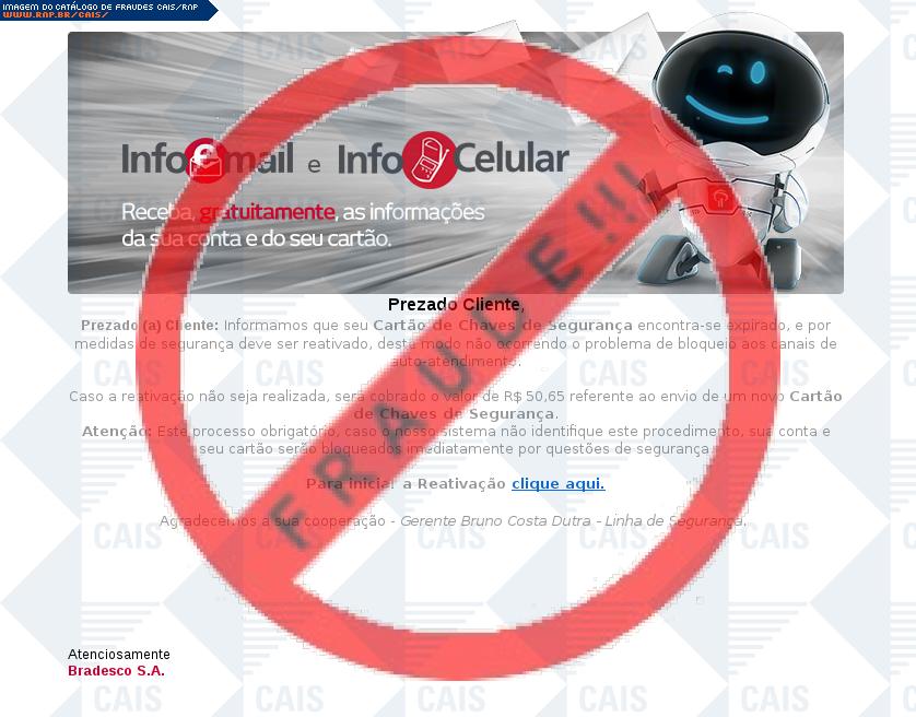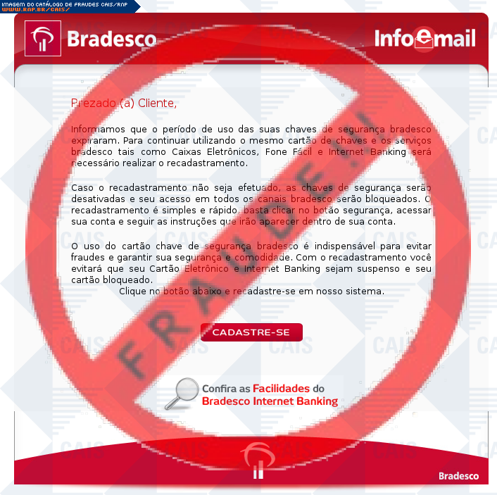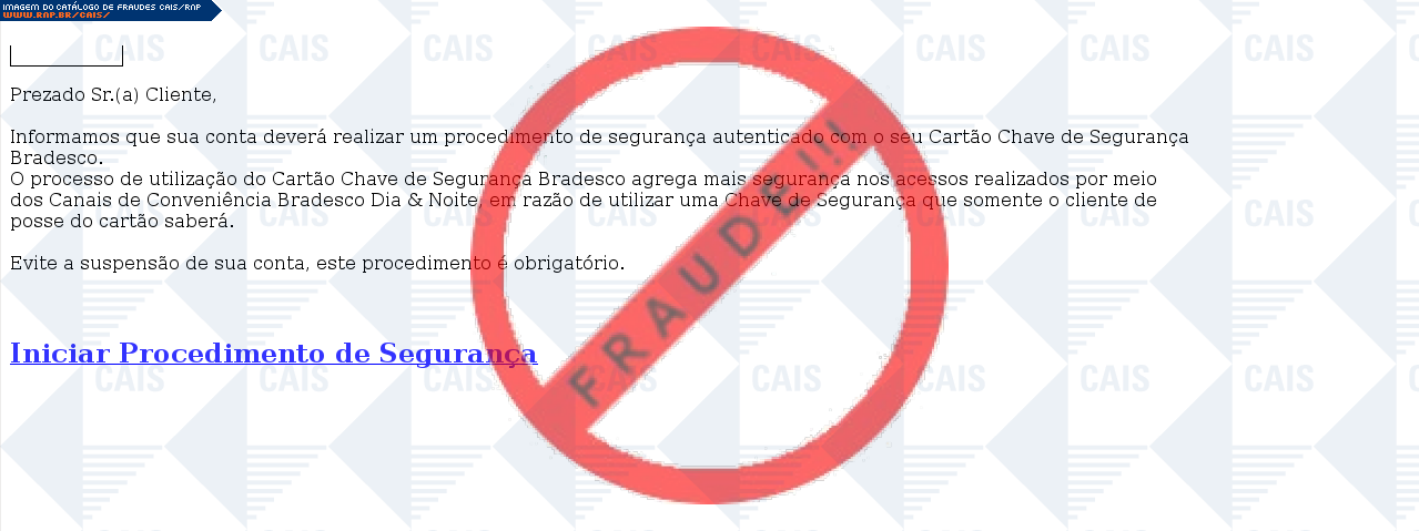 | comentário | O usuário recebe um e-mail informando que seu cartão chave de segurança da conta do banco Bradesco encontra-se desatualizado sendo necessário realizar a atualização no link disponibilizado, entretanto a página fornecida é falsa criada para roubar os dados... (leia mais) | |