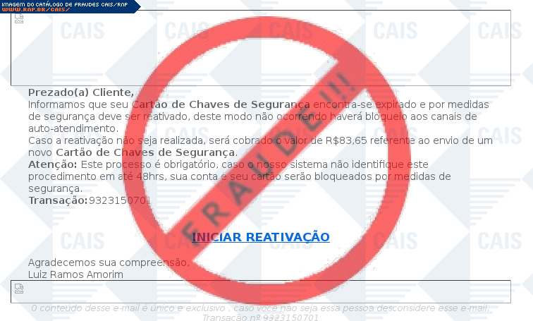 Esta página tem função informativa e educativa. Exibe uma coleção de imagens de phishing scam (fraudes eletrônicas) ou malware (código malicioso) veiculados por meio de spam (e-mail não-solicitado). Trata-se de conteúdo exemplificativo, não exaustivo, uma vez que não é possível contemplar todos os casos de fraudes existentes. Assim, caso você tenha conhecimento de um exemplar que não esteja aqui presente, isto não significa que não seja válido ou real. Inclusive incentivamos que você o envie para análise do CAIS para que, se for o caso, passe a integrar o nosso acervo.