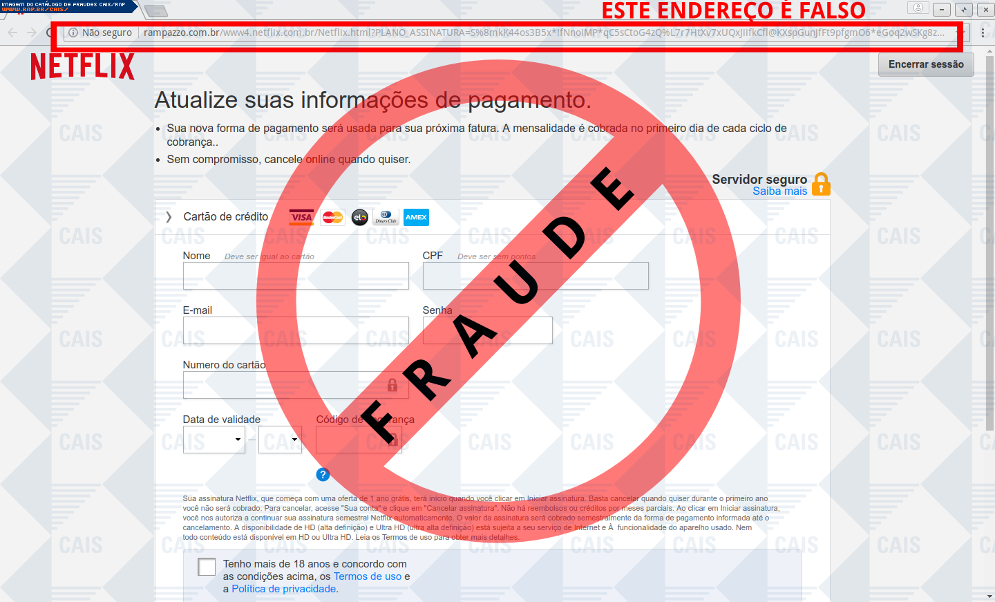 | comentário | Vítima recebe email informando que sua conta da Netflix foi bloqueada e disponibiliza link para regularização. Site falso rouba informaçôes do usuário | |