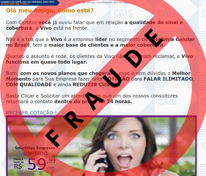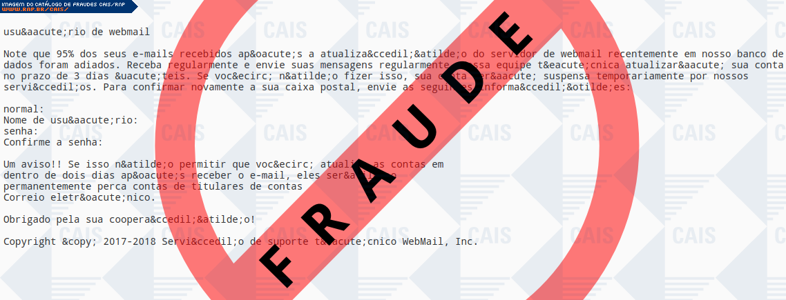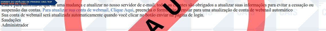 Esta página tem função informativa e educativa. Exibe uma coleção de imagens de phishing scam (fraudes eletrônicas) ou malware (código malicioso) veiculados por meio de spam (e-mail não-solicitado). Trata-se de conteúdo exemplificativo, não exaustivo, uma vez que não é possível contemplar todos os casos de fraudes existentes. Assim, caso você tenha conhecimento de um exemplar que não esteja aqui presente, isto não significa que não seja válido ou real. Inclusive incentivamos que você o envie para análise do CAIS para que, se for o caso, passe a integrar o nosso acervo.