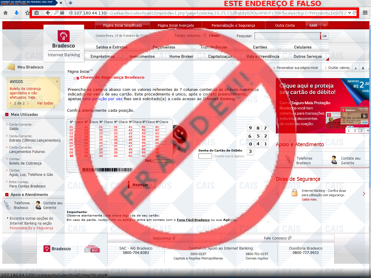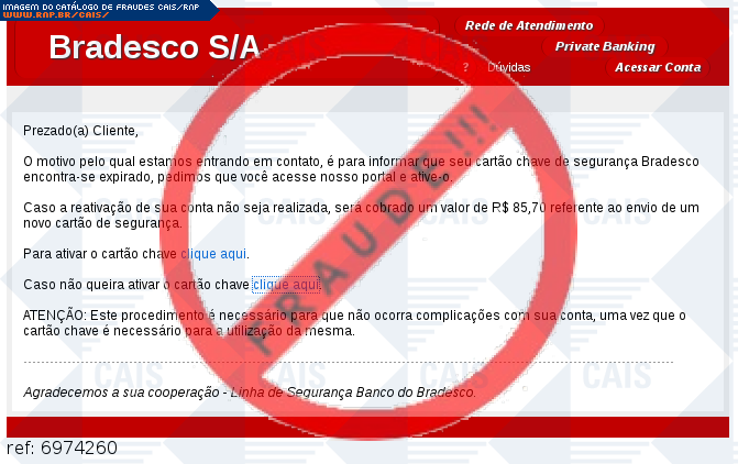 | comentário | A vítima recebe um email dizendo que seu cartão de chaves de segurança do Bradesco foi cancelado e que precisa fazer a reativação de sua conta através de um link passado na mensagem. Porém, o link leva a uma página falsa que tenta roubar as informações bancárias... (leia mais) | |