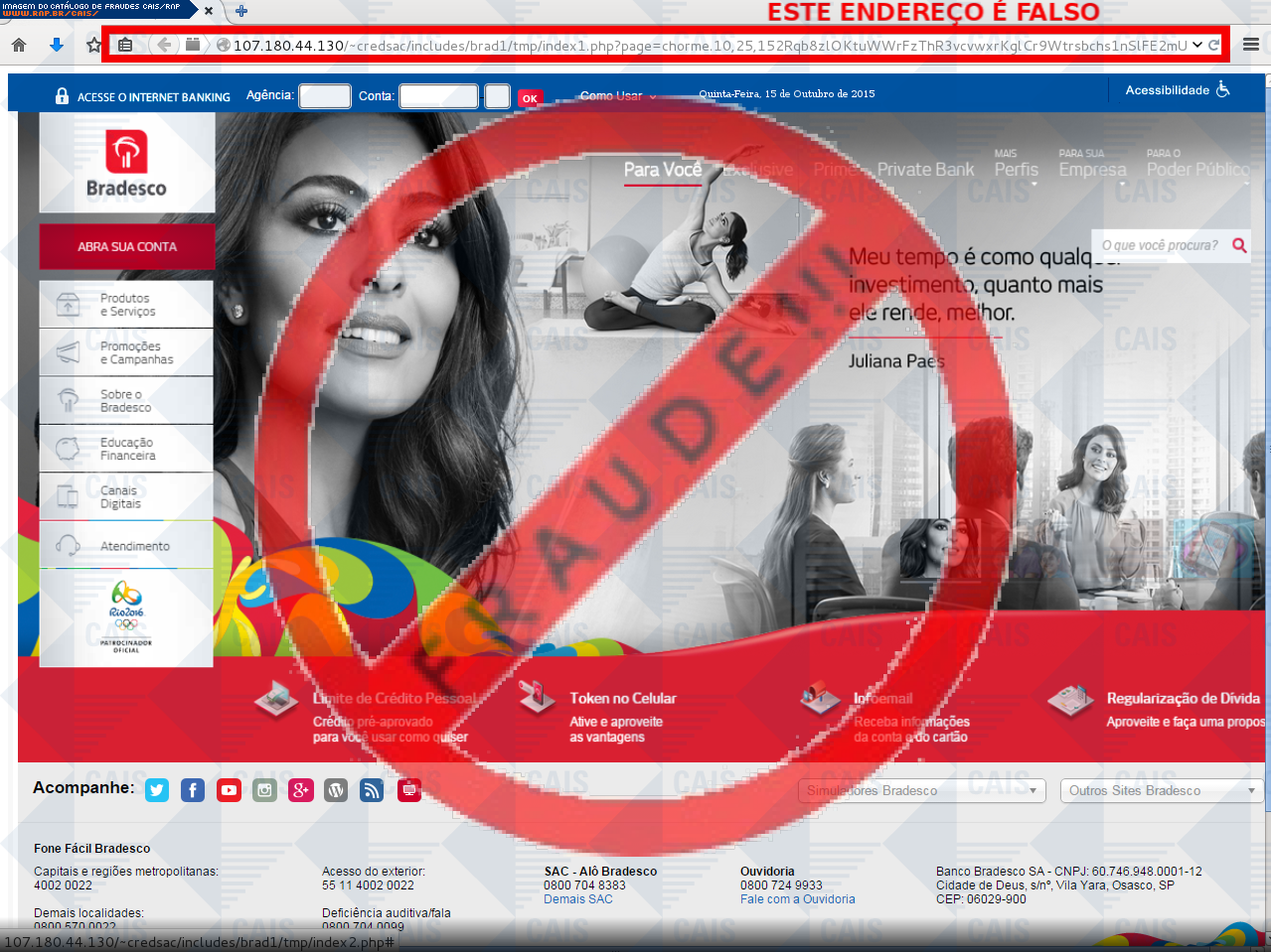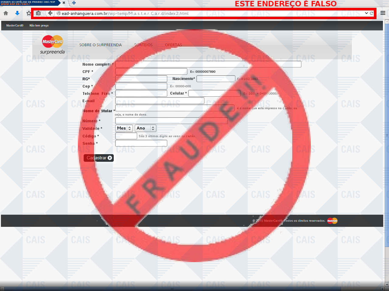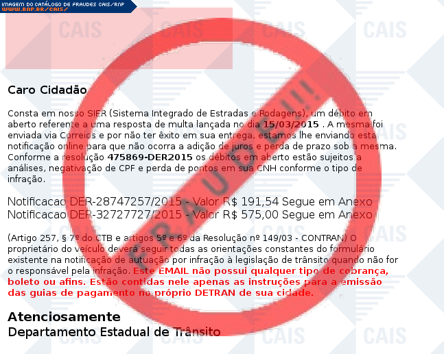 Esta página tem função informativa e educativa. Exibe uma coleção de imagens de phishing scam (fraudes eletrônicas) ou malware (código malicioso) veiculados por meio de spam (e-mail não-solicitado). Trata-se de conteúdo exemplificativo, não exaustivo, uma vez que não é possível contemplar todos os casos de fraudes existentes. Assim, caso você tenha conhecimento de um exemplar que não esteja aqui presente, isto não significa que não seja válido ou real. Inclusive incentivamos que você o envie para análise do CAIS para que, se for o caso, passe a integrar o nosso acervo.