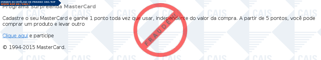 | comentário | A vítima recebe uma mensagem informando sobre uma promoção da Mastercard e com um link para cadastro na mesma. Entretanto, o link leva a uma página falsa que tenta roubar informações de cartão de crédito da vítima. | |