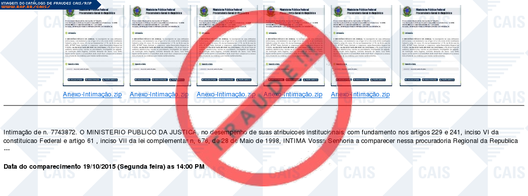 | comentário | A vítima recebe um email com um link para uma suposta intimação judicial. Entretanto o link leva ao download de um malware de nome Trojan-Downloader.MSIL.Banload. | |