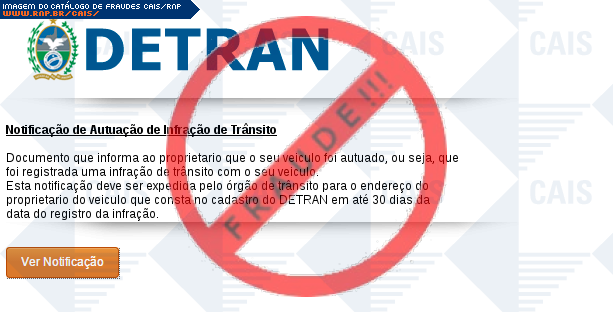 | comentário | A vítima recebe um email com uma suposta notificação do Detran e uma multa em anexo. Entretanto, o email é falso e o anexo na verdade contém um malware de nome Trojan.VB.Agent.SH. | |