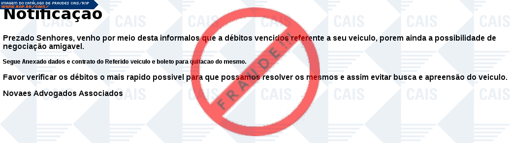 | comentário | A vítima recebe um email de uma suposta firma de advogados informando que há débitos veiculares vencidos em seu nome, além de um arquivo em anexo onde estariam o contrato e o boleto para pagamento. Porém, o anexo é na verdade um malware de nome Trojan.Agent.BNME... (leia mais) | |