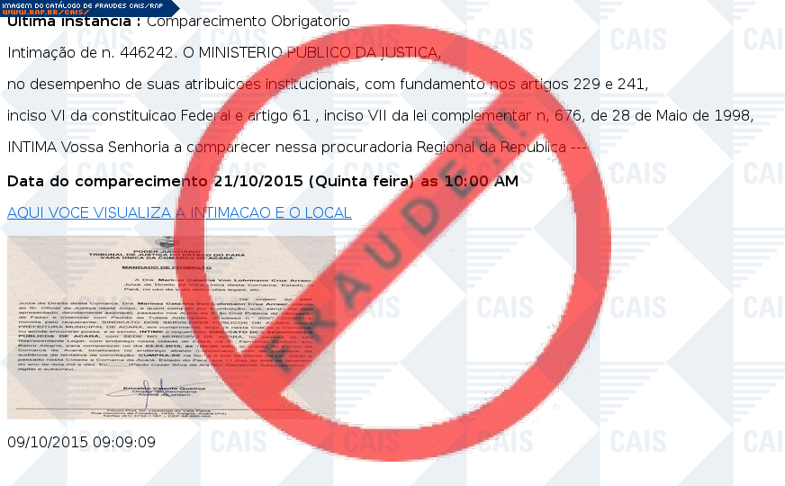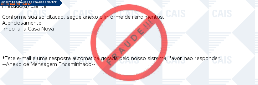 Esta página tem função informativa e educativa. Exibe uma coleção de imagens de phishing scam (fraudes eletrônicas) ou malware (código malicioso) veiculados por meio de spam (e-mail não-solicitado). Trata-se de conteúdo exemplificativo, não exaustivo, uma vez que não é possível contemplar todos os casos de fraudes existentes. Assim, caso você tenha conhecimento de um exemplar que não esteja aqui presente, isto não significa que não seja válido ou real. Inclusive incentivamos que você o envie para análise do CAIS para que, se for o caso, passe a integrar o nosso acervo.