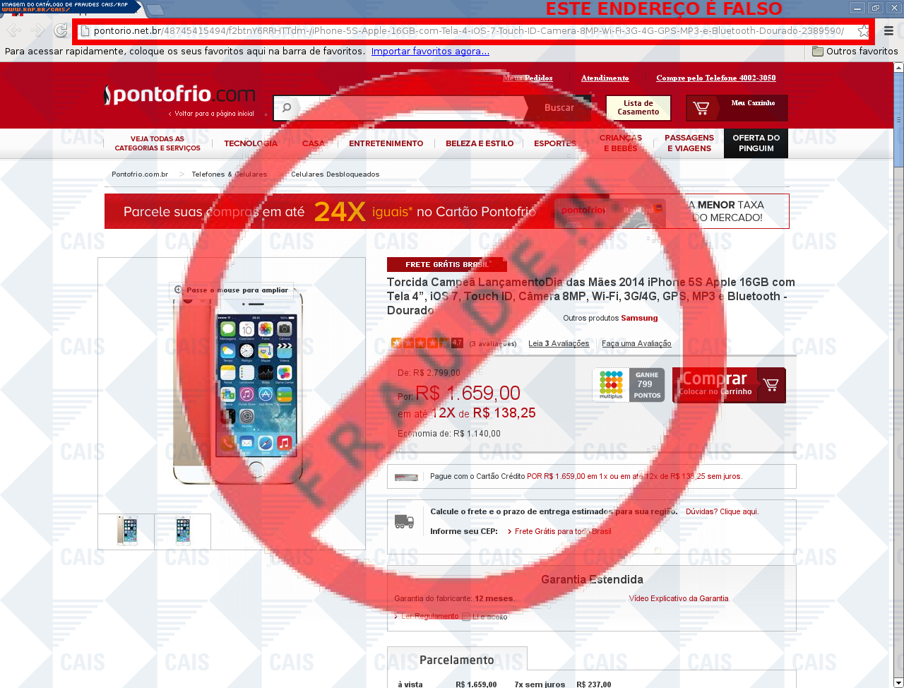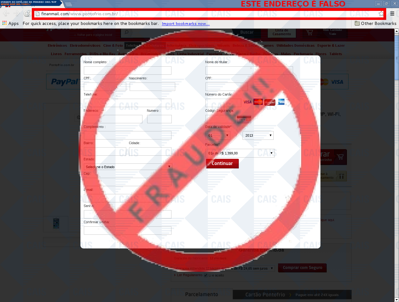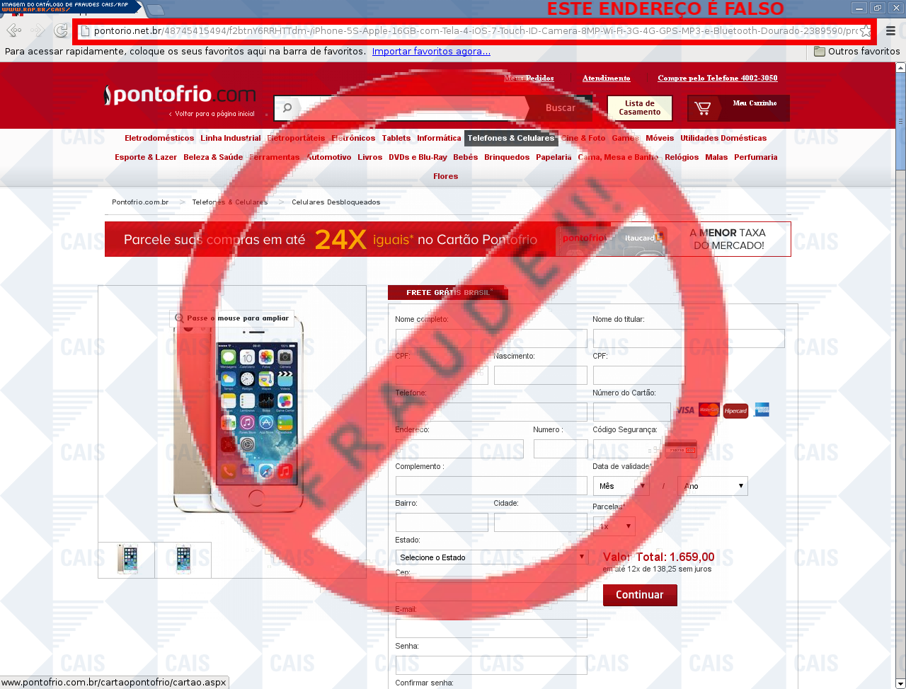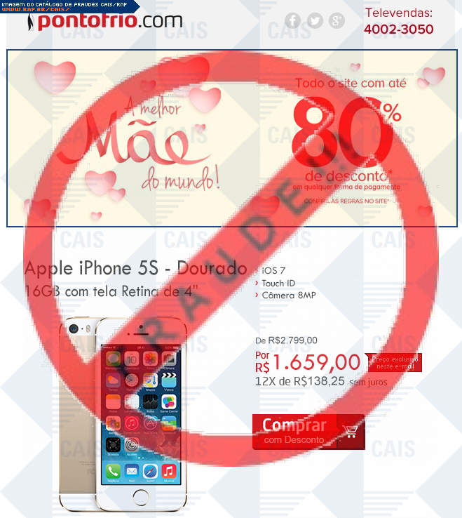 | comentário | A vítima recebe um e-mail informando sobre promoções no site de compra da Ponto Frio disponibilizando link de vários produtos em desconto, no entanto a página é falsa destinada a roubar as informações pessoais e do cartão do usuário. | |