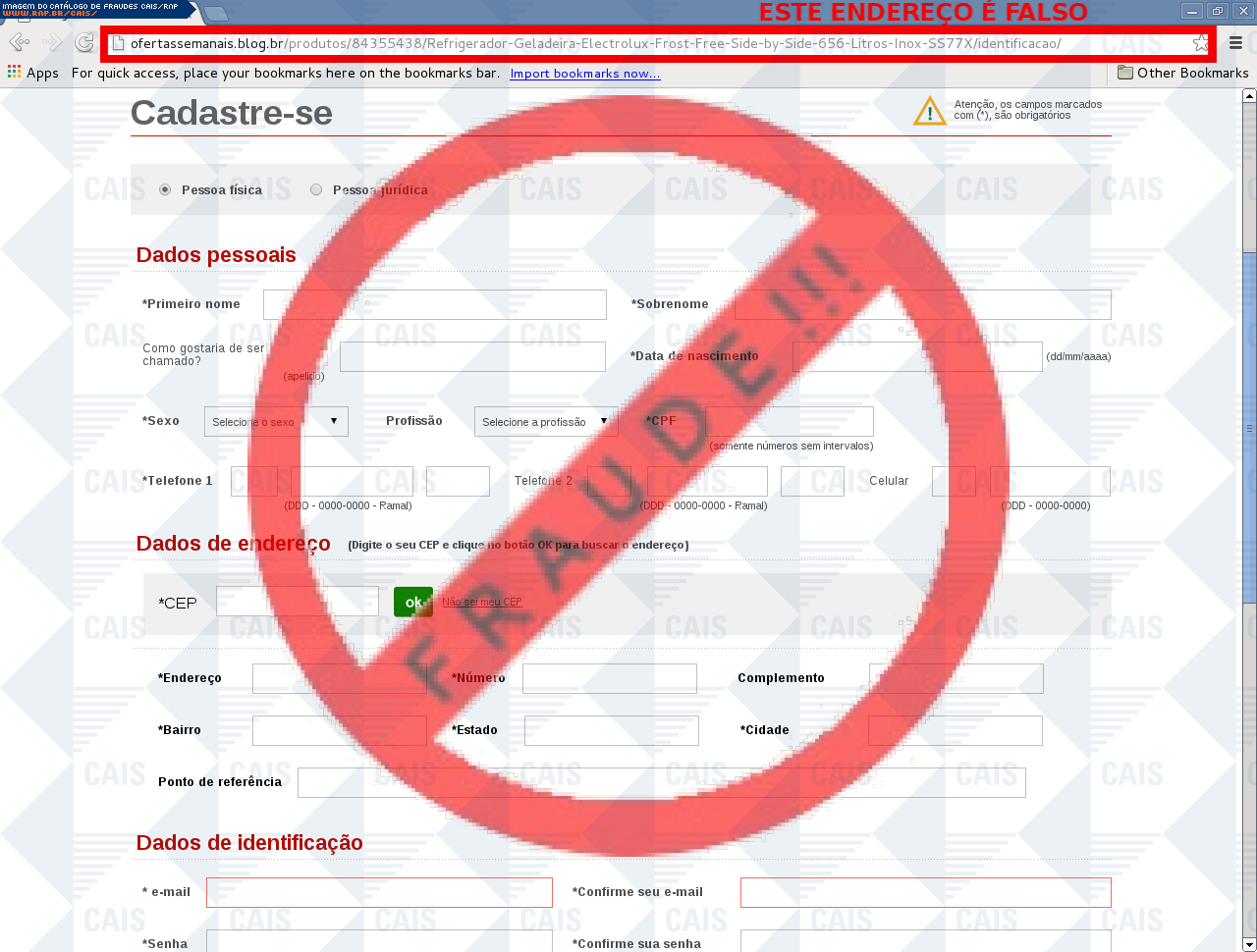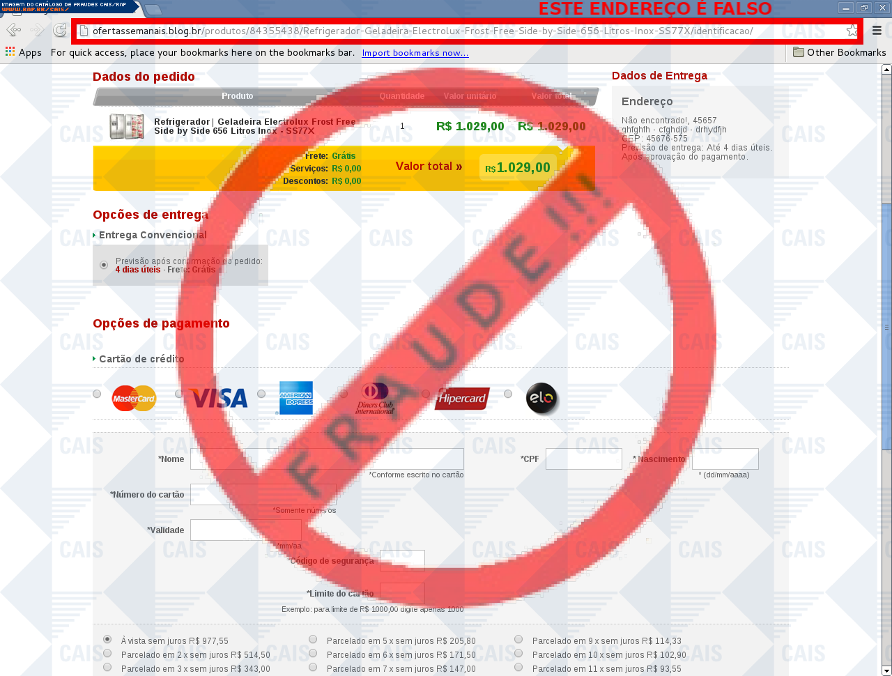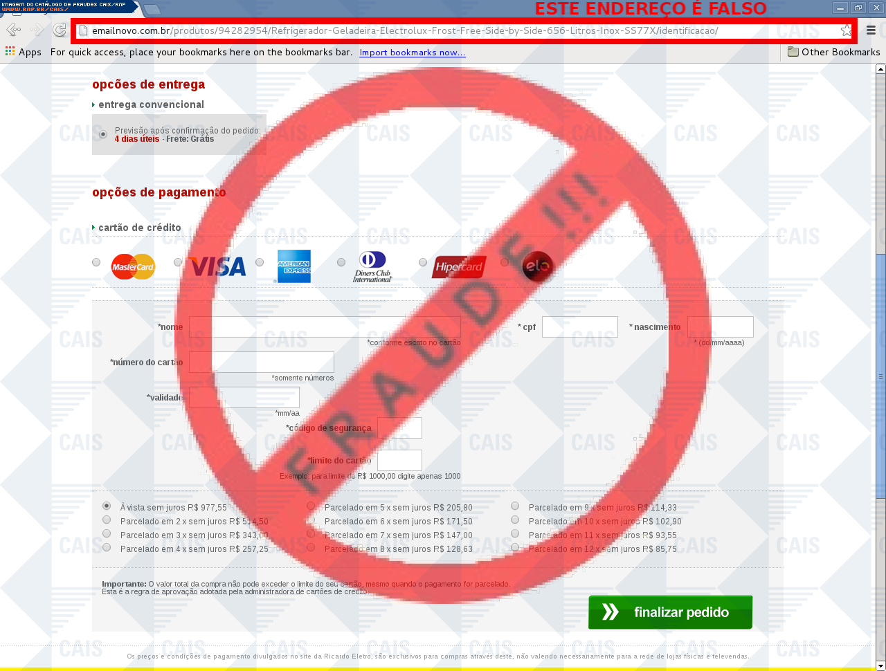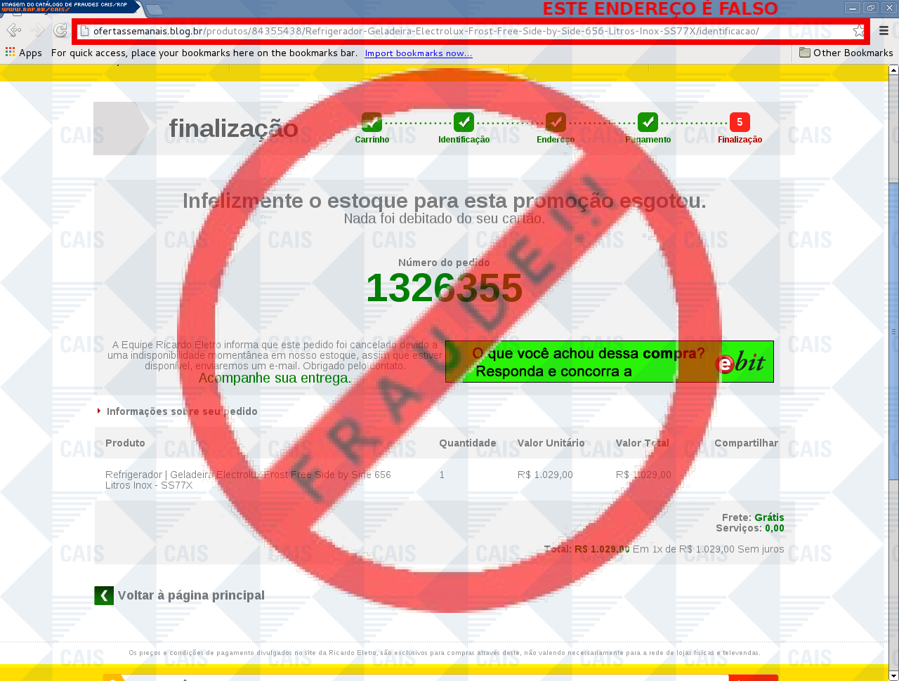 | comentário | A vítima recebe uma mensagem, contendo uma oferta de uma geladeira, mas ao clicar no link, a vítima é direcionada para uma página falsa, que é muito semelhante a original. Essa página simula uma compra, coletando várias informações da vítima. | |