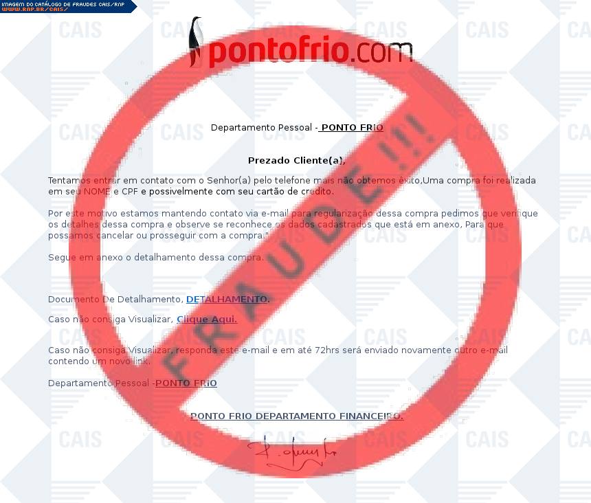 Esta página tem função informativa e educativa. Exibe uma coleção de imagens de phishing scam (fraudes eletrônicas) ou malware (código malicioso) veiculados por meio de spam (e-mail não-solicitado). Trata-se de conteúdo exemplificativo, não exaustivo, uma vez que não é possível contemplar todos os casos de fraudes existentes. Assim, caso você tenha conhecimento de um exemplar que não esteja aqui presente, isto não significa que não seja válido ou real. Inclusive incentivamos que você o envie para análise do CAIS para que, se for o caso, passe a integrar o nosso acervo.