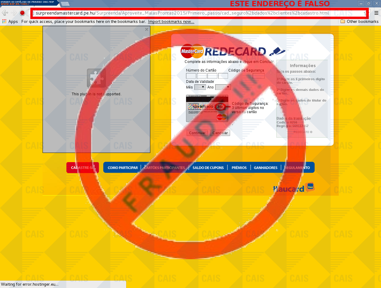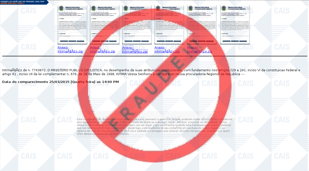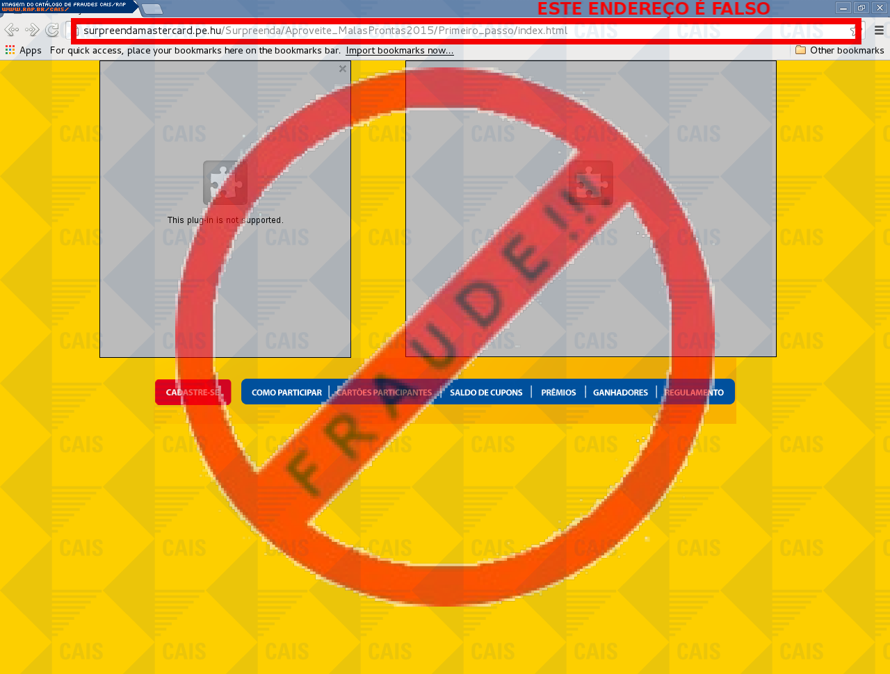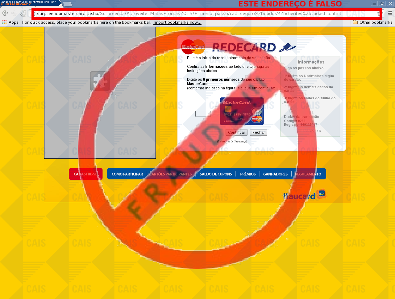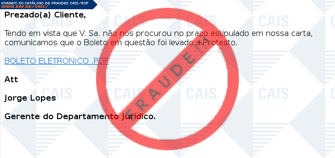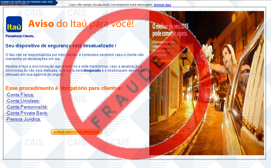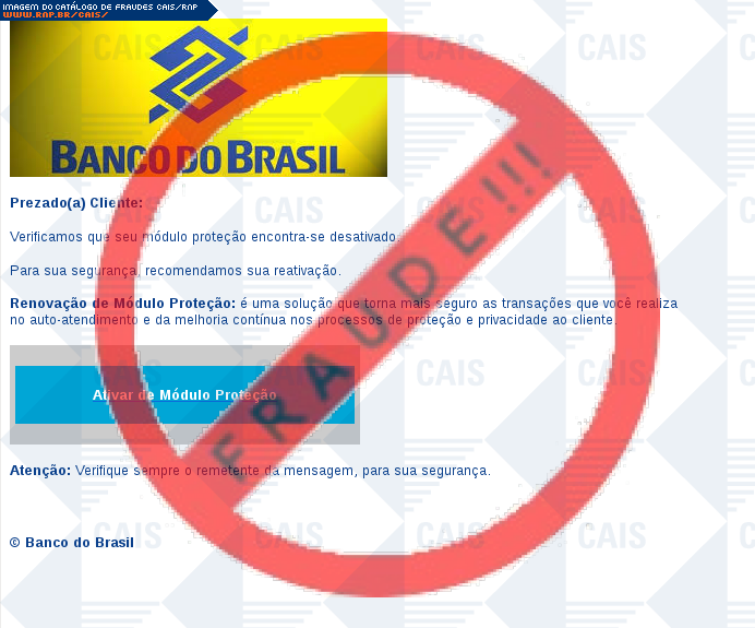 Esta página tem função informativa e educativa. Exibe uma coleção de imagens de phishing scam (fraudes eletrônicas) ou malware (código malicioso) veiculados por meio de spam (e-mail não-solicitado). Trata-se de conteúdo exemplificativo, não exaustivo, uma vez que não é possível contemplar todos os casos de fraudes existentes. Assim, caso você tenha conhecimento de um exemplar que não esteja aqui presente, isto não significa que não seja válido ou real. Inclusive incentivamos que você o envie para análise do CAIS para que, se for o caso, passe a integrar o nosso acervo.